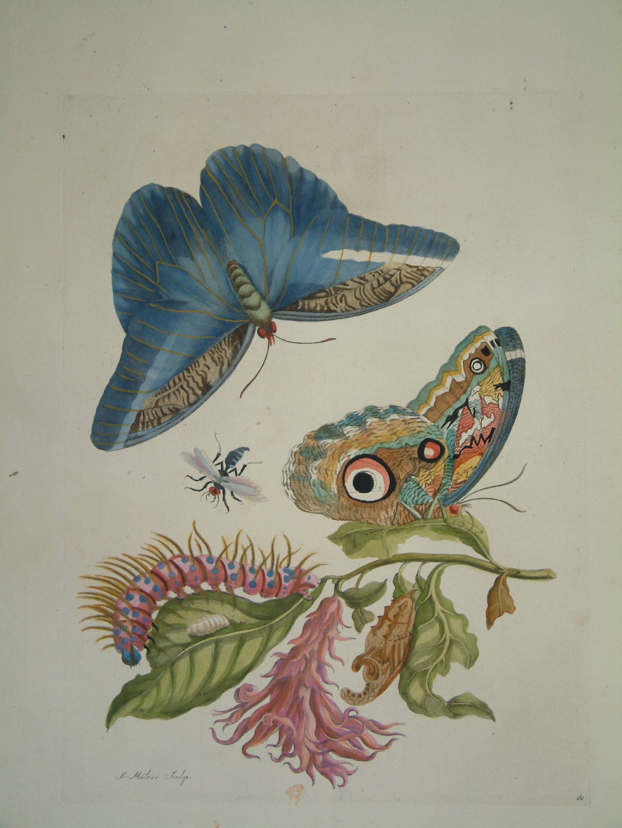 Maria Sibylla Merian (1647-1717) is most famous for two published works, the ‘Dissertatio de Generatione et Metamorphosibus Insectorum Surinamensium’ first published in 1705 and ‘De Europische Insecten’ of 1730, both published in Amsterdam. Maria was the daughter of Matthias Merian (1593-1650) a noted engraver and publisher. She devoted her life to the study of insects and their metamorphoses. Noting the fascinating insects returning from the Dutch colony in South America, she set sail with her daughter Dorothea in 1699 for Surinam where she remained until 1701. Her work was the first to show the European public the beauty and wealth of the insect life in the region. The various stages of caterpillar and butterfly are all shown amongst native flora and fruiting plants. The daughter Maria returned to Surinam to complete with work which was expanded with 12 further plates and published two years after her mother’s death in 1719. A third edition appeared in 1726. Dunthorne (1938) 205; ‘Great Flower Books’ (1956) p. 67; Hunt (1958) 467; Landwehr (1976) 131; Nissen (1966) 1341.