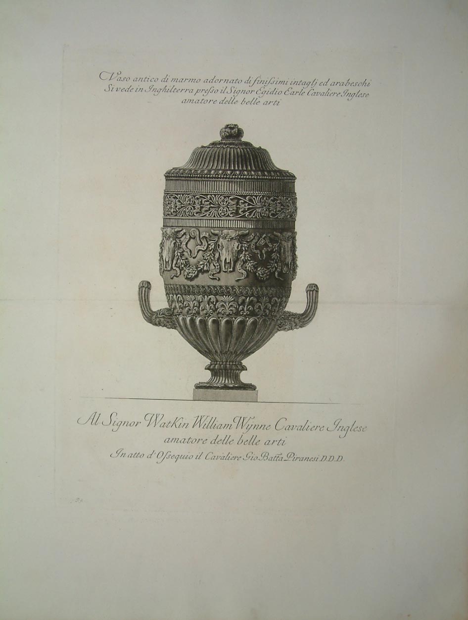 Giovanni Battista Piranesi (1720-78) was born in Venice the son of a stonemason and educated as an architect. At the age of twenty he went to Rome as a draughtsman for the Venetian ambassador. He spent time learning from the leading printmakers of his day including Giuseppe Vasi and in 1745 settled there. He extended his abilities in etching to developing a unique style capable of displaying greater contrast between light and dark than previously possible. His ability at illustrating perspective was technically far more advanced than any of his contemporaries and with the backdrop of ancient Rome to work with, he flourished. Arguably his two most famous works are the ‘Vedute di Roma’ published 1748 78 and the ‘Vasi, Candelabri, Cippi, Sarcofagi’ in 1778. His total output is reputed at nearly a thousand plates, mostly folio in size. His works were a common acquisition of the English gentry on their Grand Tour and he personally knew many of influence including Robert Adam. He was elected a fellow of the Society of Antiquaries in 1757 and was knighted by the Pope in 1765. He is buried in S. Maria Aventina, Rome. Hind, A. M. “Giovanni Battista Piranesi: a critical study”, London, 1922.