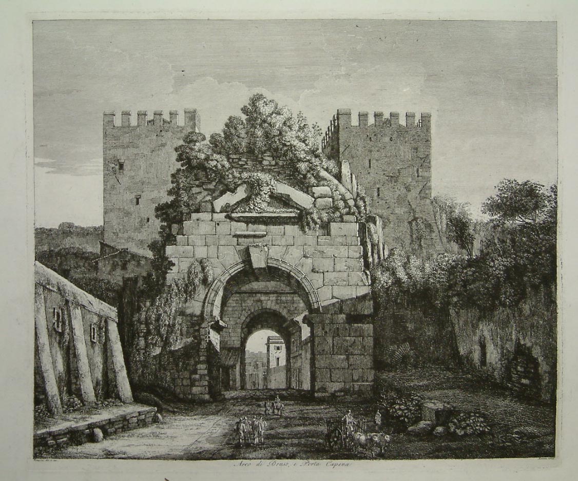 Luigi Rossini (1790-1857) was a native of Ravenna but soon moved to Bologna where he became an assistant to Antonio Basoli at 18 years old. At 24 he moved to Rome he put to use his study of architecture. Being a great admirer of Piranesi he turned to the art of etching and emulated him as much as possible. ‘Le Antichita Romane’ was first published in 1823. Berlin Kat. 1916.