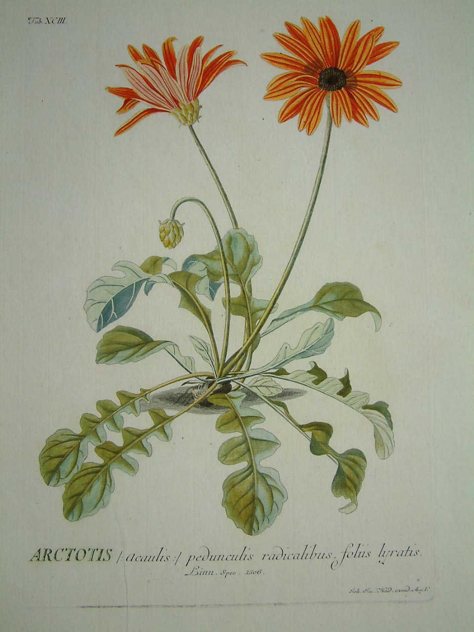 Christoph Jacob Trew (1695-1769) was a wealthy physician and noted bibliophile. The artist George Dionysius Ehret (1708-70) enjoyed the lifelong patronage of Trew and they became great friends. It was Trew who encouraged Ehret to study the plants from a scientific perspective as well as an artistic one. Trew supported the publication of the ‘Plantae Selectae’ from 1750 for which he supplied the descriptions, it has been called ‘one of the greatest eighteenth century botanical books published’ (De Belder) and is distinguished by its gold titles. Hunt states that Ehret’s illustrations ‘achieve realism, majesty, ineffable colour, all in one breathtaking look’. The ‘Hortus Nitidissimus’ was called “the most sumptuous of the florilegia” in the De Belder catalogue. Trew intended the book to be a magnificent ‘gallery of the most colourful and ravishing flowers that could be grown in Europe’. Like the ‘Plantae Selectae’ being published at the same time, many of the plates are the work of Ehret. Here however, he concentrates on displaying the flowers at their full beauty. De Belder (1987) 362-3; Dunthorne 309 & 310; ‘Great Flower Books’ (1956) p. 78; Hunt (1958) 539; Nissen BBI (1966) 1995 & 1997.
