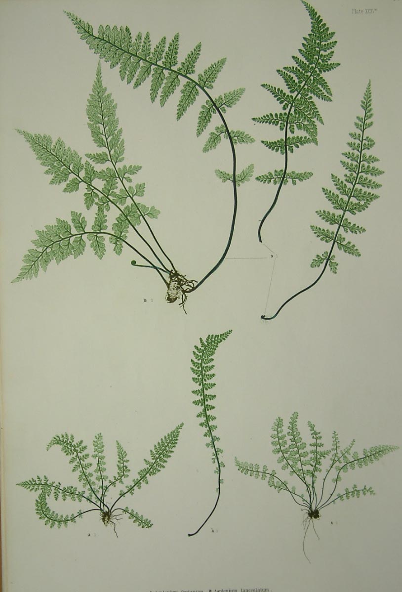The ‘Ferns of Great Britain and Ireland’ was written by Thomas Moore (1821-87), who was the curator of the Chelsea Botanic Garden and edited by John Lindley (1799-1865). Henry Bradbury (1829-60) was the eldest son of William Bradbury of Bradbury & Evans, printers and publishers. In 1850 Henry Bradbury went to Vienna to study at the Imperial printing office where he learnt of nature printing, where impressions of natural objects are made on printing plates. Back in London he used a similar process to produce the plates for Moore’s work on ferns. This famous book was one of the first nature-printed books produced in Britain. There were numerous claims to the patent and invention of the technique and Bradbury was heavily embroiled in it all. So much so that it is quite possible that it led to his early death when he committed suicide by drinking acid. Fischer (1933) 89-91; Nissen BBI (1966) 1400; ODNB; Stafleu & Cowan (1976-86) 6275.