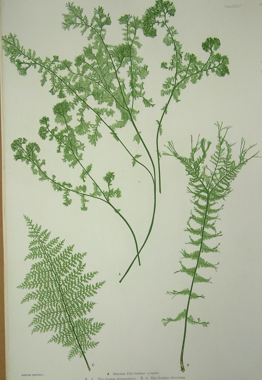 The ‘Ferns of Great Britain and Ireland’ was written by Thomas Moore (1821-87), who was the curator of the Chelsea Botanic Garden and edited by John Lindley (1799-1865). Henry Bradbury (1829-60) was the eldest son of William Bradbury of Bradbury & Evans, printers and publishers. In 1850 Henry Bradbury went to Vienna to study at the Imperial printing office where he learnt of nature printing, where impressions of natural objects are made on printing plates. Back in London he used a similar process to produce the plates for Moore’s work on ferns. This famous book was one of the first nature-printed books produced in Britain. There were numerous claims to the patent and invention of the technique and Bradbury was heavily embroiled in it all. So much so that it is quite possible that it led to his early death when he committed suicide by drinking acid. Fischer (1933) 89-91; Nissen BBI (1966) 1400; ODNB; Stafleu & Cowan (1976-86) 6275.