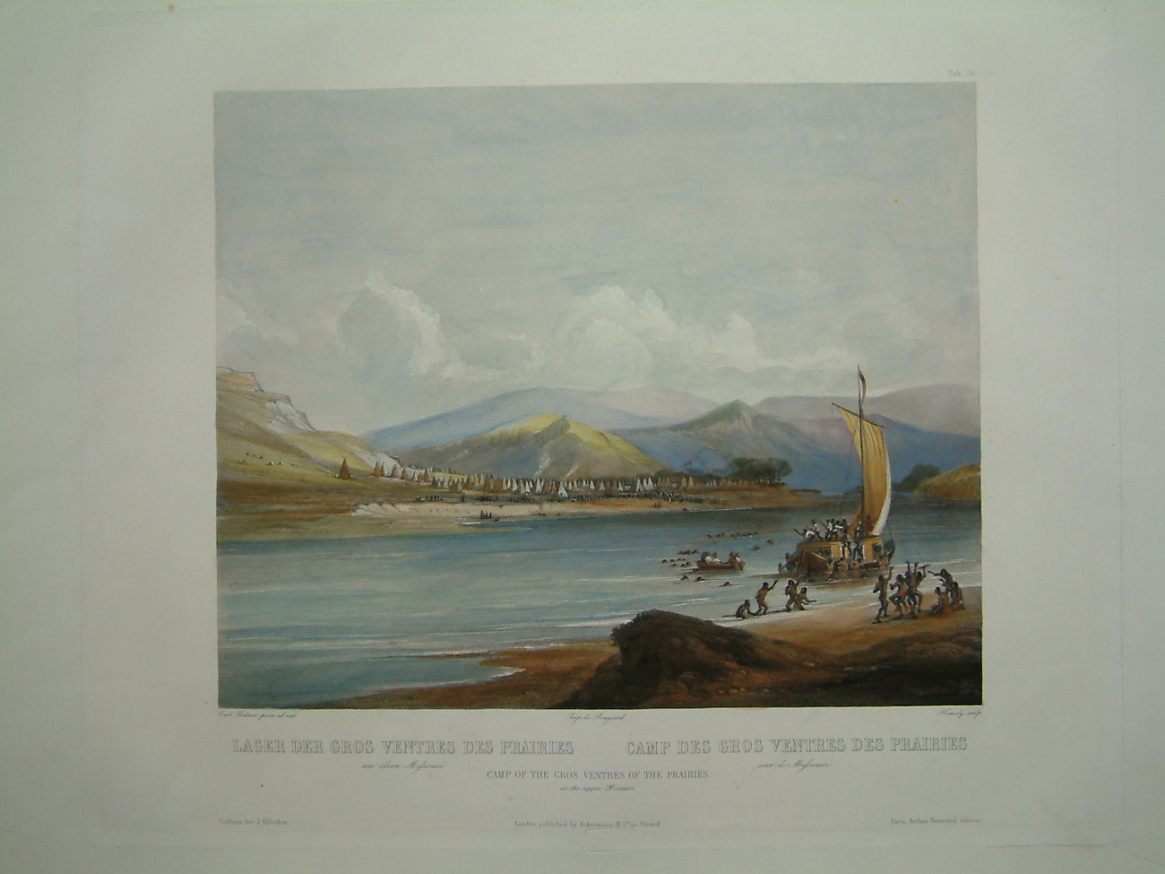 This is undoubtedly the finest plate book on Native American Indians ever published. The artist Karl Bodmer (1809-93) went on the expedition of Prince Maximilian to the Plains of North America. They travelled up the Missouri River from St. Louis passing the forts of the American Fur Company. The Sioux were one of the first they encountered recording their ceremonial dances. They continued by steamer to Fort Clark studying along the way the life of the Mandan, Mintari and Crow tribes. At Fort Union they encountered the Cree and Assiniboin. This was the main base of the American Fur Company. They then proceeded through the geological beauty of the next section of the Missouri to Fort Mackenzie in present day Montana, where they spent a month building relationships with the fearsome Blackfoot tribe. As winter was setting in this was their turning point and the return journey was made downstream. The finished prints accompanied the text of Maximilian and was published as ‘Reise in das Innere Nord-America’. The quality of the engraving and the realism of the individual portraits are praised to the highest degree. Abbey ‘Travel’ (1956) 615; Howes (1962) M443a; Sabin (1868-1936) 47015; Wagner-Camp (1982) 76.2.