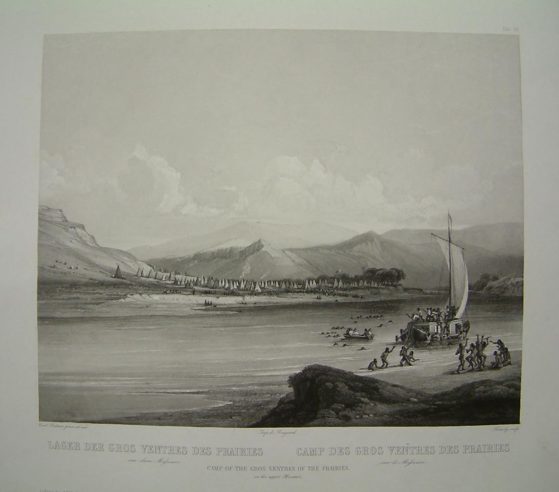 This is undoubtedly the finest plate book on Native American Indians ever published. The artist Karl Bodmer (1809-93) went on the expedition of Prince Maximilian to the Plains of North America. They travelled up the Missouri River from St. Louis passing the forts of the American Fur Company. The Sioux were one of the first they encountered recording their ceremonial dances. They continued by steamer to Fort Clark studying along the way the life of the Mandan, Mintari and Crow tribes. At Fort Union they encountered the Cree and Assiniboin. This was the main base of the American Fur Company. They then proceeded through the geological beauty of the next section of the Missouri to Fort Mackenzie in present day Montana, where they spent a month building relationships with the fearsome Blackfoot tribe. As winter was setting in this was their turning point and the return journey was made downstream. The finished prints accompanied the text of Maximilian and was published as ‘Reise in das Innere Nord-America’. The quality of the engraving and the realism of the individual portraits are praised to the highest degree. Abbey ‘Travel’ (1956) 615; Howes (1962) M443a; Sabin (1868-1936) 47015; Wagner-Camp (1982) 76.2.