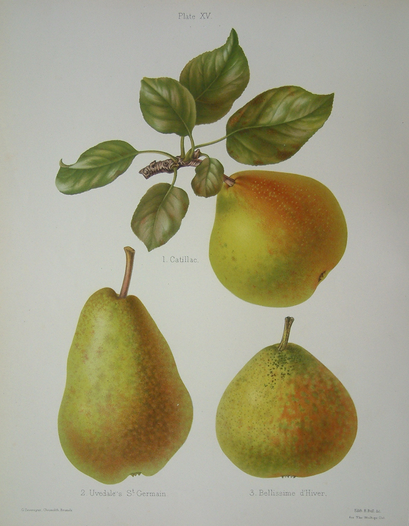 The Woolhope Naturalists’ Field Club was based in Hereford, the capital of a county famous for its apples and pears. The Club’s Pomology Committee was headed by the Reverend Charles Henry Bulmer whose sons in 1887 founded the company which today is now the largest cider-maker in the world. In 1876 the Club considered publishing a ‘Herefordshire Pomona’ and collected 1200 plates for two exhibitions. From these a selection was made for which further descriptions were required. The first of seven parts was published in the autumn of 1878 and following issues were approximately every year until 1885. The artists used all eight autumn seasons and their sunny hours to record 432 varieties of apples and pears. The descriptions were the work of Doctor Robert Hogg (1818-97) with the various introductory material being the work of the overall editor Doctor Henry Graves Bull (c.1818-85). It is considered a vital book in the history of each variety. ‘An Oak Spring Pomona’ (1990) pp. 218-222.