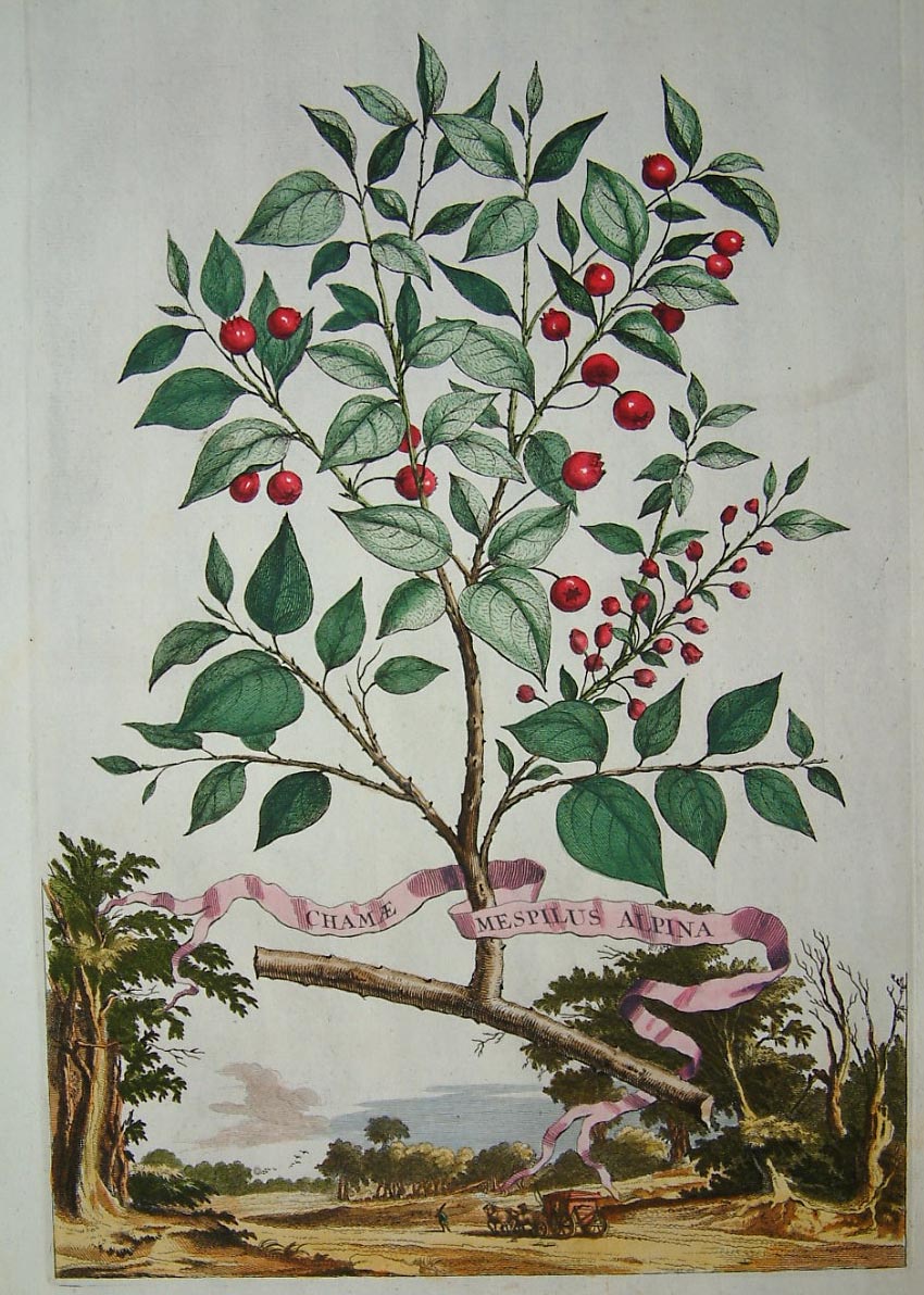 The author, Abraham Munting (1626-83), was an eminent professor of botany and chemistry at the University of Groningen. He travelled extensively and returning to Groningen he founded one of the most extensive botanical gardens of the time. Munting wrote several works but he is most known for his posthumous ‘Naauwkeurige Beschryving der Aardgewassen’ published in 1696. The stunning plates depict plants set in or floating above landscape gardens, a major break from the usual depictions to date. Hunt describes it as a weird and fascinating work: ‘The plates are as curious as their subjects. They commonly present the plants far larger than life, oranges huge as pumpkins, cyclamens with heavy corms floating lightly in mid-air, gently geraniums grown into giant trees. The effect is obtained through sketching in classical or idyllic or mountainous little landscapes below.’ The Latin names are present on scrolls and tablets. Hunt (1958) 404; Nissen BBI (1966) 1428; ‘Oak Spring Flora’ (1997) pp. 172-5.