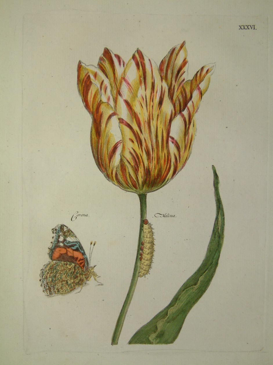 The publishers of the rare ‘Nederlandsche Bloemwerk’ were members of the society of Dutch nurserymen. The author of this work is unknown and it is usually listed under its title. The work was issued to subscribers, only 66 are named. Both Nissen and Plesch assign the engraving to Paul Theodor can Brussel (1754-95), though he signs only one plate. The bugs, caterpillars and moths are reminiscent of the work of Maria Sibylla Merian. Dunthorne (1938) 215; ‘Great Flower Books’ (1956) p. 47; Hunt (1958) 733; Landwehr (1976) 29; Nissen BBI (1966) 2219.