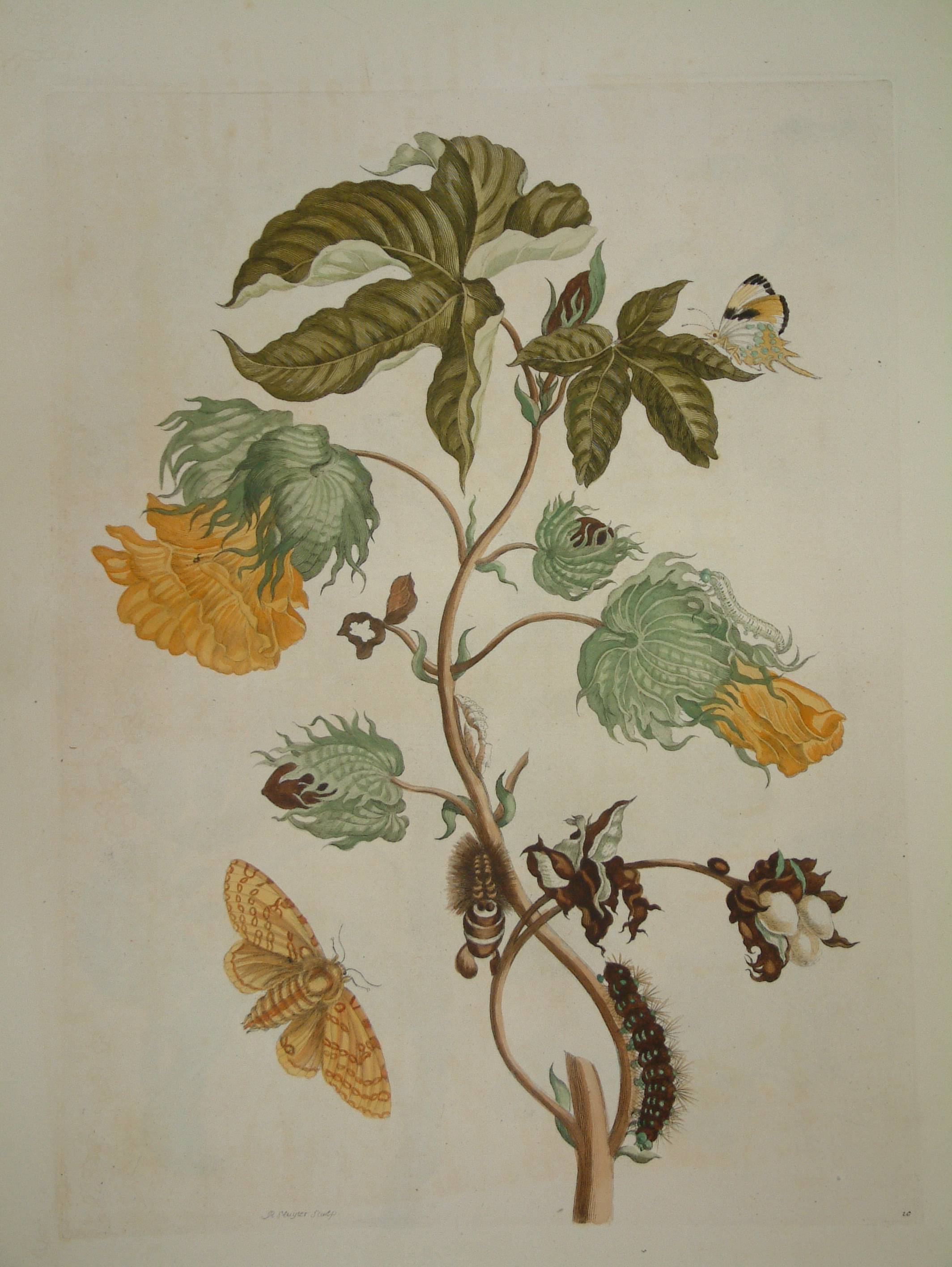 Maria Sibylla Merian (1647-1717) is most famous for two published works, the ‘Dissertatio de Generatione et Metamorphosibus Insectorum Surinamensium’ first published in 1705 and ‘De Europische Insecten’ of 1730, both published in Amsterdam. Maria was the daughter of Matthias Merian (1593-1650) a noted engraver and publisher. She devoted her life to the study of insects and their metamorphoses. Noting the fascinating insects returning from the Dutch colony in South America, she set sail with her daughter Dorothea in 1699 for Surinam where she remained until 1701. Her work was the first to show the European public the beauty and wealth of the insect life in the region. The various stages of caterpillar and butterfly are all shown amongst native flora and fruiting plants. The daughter Maria returned to Surinam to complete with work which was expanded with 12 further plates and published two years after her mother’s death in 1719. A third edition appeared in 1726. Dunthorne (1938) 205; ‘Great Flower Books’ (1956) p. 67; Hunt (1958) 467; Landwehr (1976) 131; Nissen (1966) 1341.
