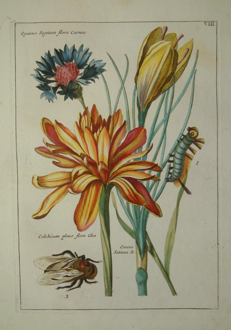 The publishers of the rare ‘Nederlandsche Bloemwerk’ were members of the society of Dutch nurserymen. The author of this work is unknown and it is usually listed under its title. The work was issued to subscribers, only 66 are named. Both Nissen and Plesch assign the engraving to Paul Theodor can Brussel (1754-95), though he signs only one plate. The bugs, caterpillars and moths are reminiscent of the work of Maria Sibylla Merian. Dunthorne (1938) 215; ‘Great Flower Books’ (1956) p. 47; Hunt (1958) 733; Landwehr (1976) 29; Nissen BBI (1966) 2219.