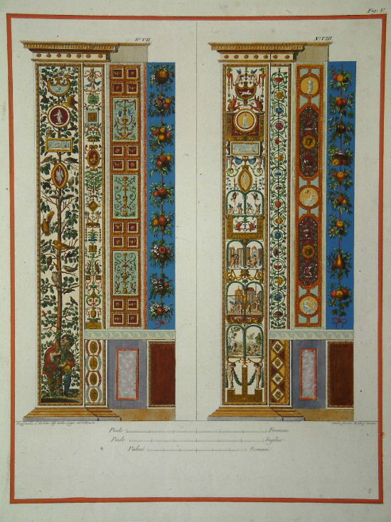 These classic engravings record the work of Raphael Sanzio da Urbino (1483-1520) in decorating the Loggie in the Vatican apartments between 1518-19 for Pope Leo X. This work entitled ‘Delle Loggie di Rafaele nel Vaticano’ was engraved by Giovanni Ottaviani (c.1734-1808) and Giovanni Volpato (1735-1803) and is remarkable for its size and the magnificent colouring found in contemporary-coloured examples. They were to have considerable influence on contemporary taste in the neo-classical period. A reduction was published in Paris 1787-90 in which two panels appear on each plate. They were beautifully engraved by J. Sticotti and published by Francois Chereau and Francois-Etienne Joubert. An edition was published in Rome around 1802. They were beautifully engraved by Carlo Lasinio under the direction of Rainaldi after the drawings of Camporesi. Brunet (1860-80) IV, pp. 1110-11; Berlin Cat. (1939) no. 4068 & 4070; ‘Universal Catalogue of Books on Art’ II p. 1689.