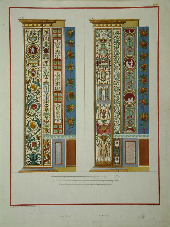 These classic engravings record the work of Raphael Sanzio da Urbino (1483-1520) in decorating the Loggie in the Vatican apartments between 1518-19 for Pope Leo X. This work entitled ‘Delle Loggie di Rafaele nel Vaticano’ was engraved by Giovanni Ottaviani (c.1734-1808) and Giovanni Volpato (1735-1803) and is remarkable for its size and the magnificent colouring found in contemporary-coloured examples. They were to have considerable influence on contemporary taste in the neo-classical period. A reduction was published in Paris 1787-90 in which two panels appear on each plate. They were beautifully engraved by J. Sticotti and published by Francois Chereau and Francois-Etienne Joubert. An edition was published in Rome around 1802. They were beautifully engraved by Carlo Lasinio under the direction of Rainaldi after the drawings of Camporesi. Brunet (1860-80) IV, pp. 1110-11; Berlin Cat. (1939) no. 4068 & 4070; ‘Universal Catalogue of Books on Art’ II p. 1689.