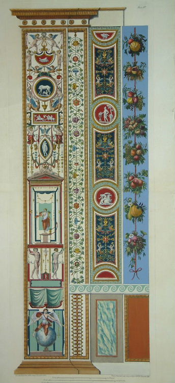 These classic engravings record the work of Raphael Sanzio da Urbino (1483-1520) in decorating the Loggie in the Vatican apartments between 1518-19 for Pope Leo X. This work entitled ‘Delle Loggie di Rafaele nel Vaticano’ was engraved by Giovanni Ottaviani (c.1734-1808) and Giovanni Volpato (1735-1803) and is remarkable for its size and the magnificent colouring found in contemporary-coloured examples. They were to have considerable influence on contemporary taste in the neo-classical period. A reduction was published in Paris 1787-90 in which two panels appear on each plate. They were beautifully engraved by J. Sticotti and published by Francois Chereau and Francois-Etienne Joubert. An edition was published in Rome around 1802. They were beautifully engraved by Carlo Lasinio under the direction of Rainaldi after the drawings of Camporesi. Brunet (1860-80) IV, pp. 1110-11; Berlin Cat. (1939) no. 4068 & 4070; ‘Universal Catalogue of Books on Art’ II p. 1689.