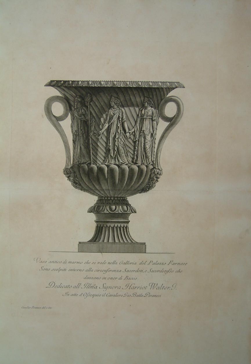 Giovanni Battista Piranesi (1720-78) was born in Venice the son of a stonemason and educated as an architect. At the age of twenty he went to Rome as a draughtsman for the Venetian ambassador. He spent time learning from the leading printmakers of his day including Giuseppe Vasi and in 1745 settled there. He extended his abilities in etching to developing a unique style capable of displaying greater contrast between light and dark than previously possible. His ability at illustrating perspective was technically far more advanced than any of his contemporaries and with the backdrop of ancient Rome to work with, he flourished. Arguably his two most famous works are the ‘Vedute di Roma’ published 1748 78 and the ‘Vasi, Candelabri, Cippi, Sarcofagi’ in 1778. His total output is reputed at nearly a thousand plates, mostly folio in size. His works were a common acquisition of the English gentry on their Grand Tour and he personally knew many of influence including Robert Adam. He was elected a fellow of the Society of Antiquaries in 1757 and was knighted by the Pope in 1765. He is buried in S. Maria Aventina, Rome. Hind, A. M. “Giovanni Battista Piranesi: a critical study”, London, 1922.