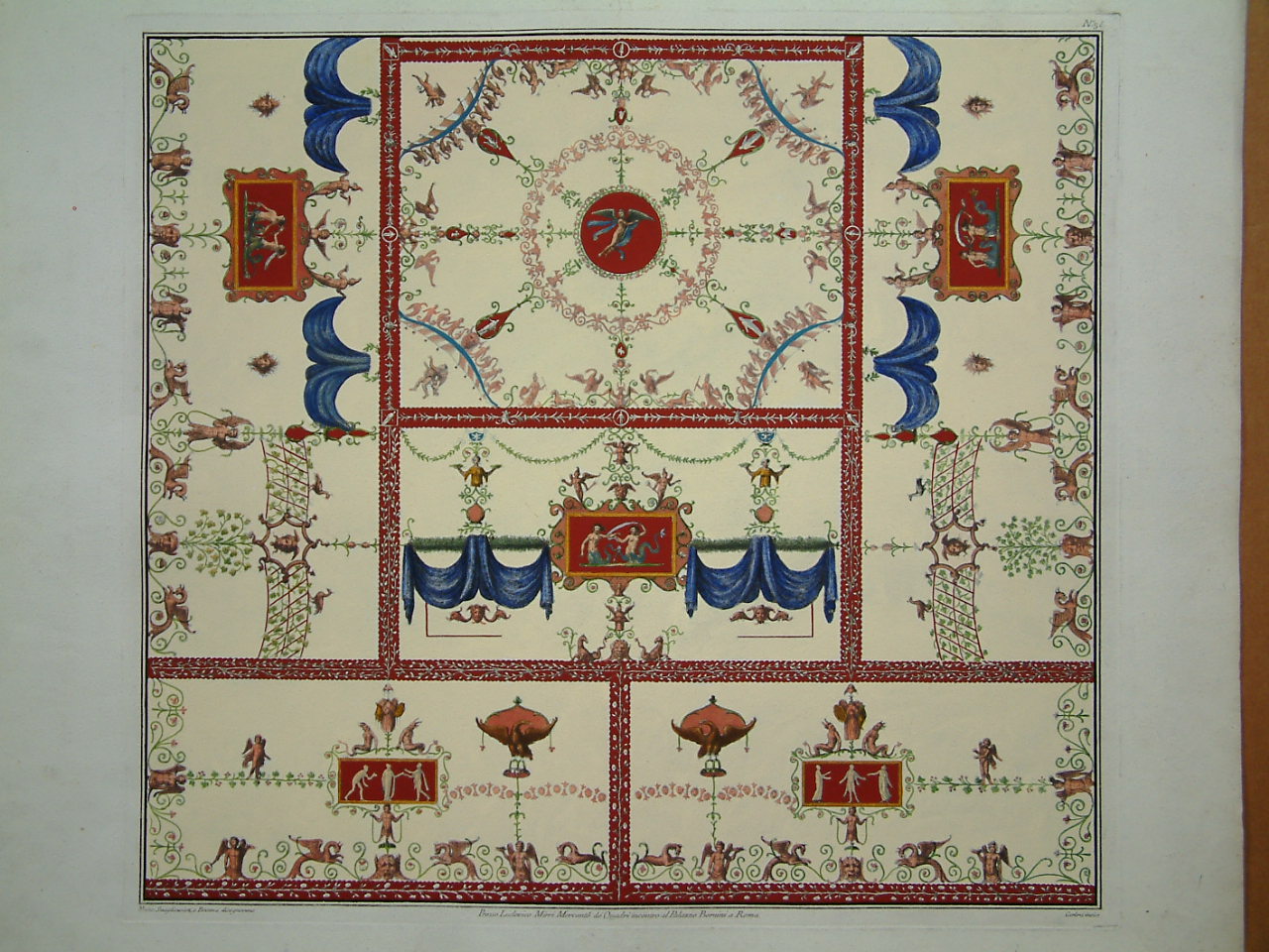 The ‘Vestigia della terme di Tito e loro interni pitture’ by Marco Carloni (1742-96) contains stunning plates illustrating the architectural features of Emperor Nero’s famous Domus Aurea. The emperor Titus had later built some baths on the site, hence the work’s title. The site had been known since the fifteenth century, but around 1774 the publisher Lodovico Mirri started re-excavating in the area with the express intention of selling engravings taken from the features of the Domus Aurea that he uncovered. The resulting album was published in plain and coloured issues. The latter is exceptionally rare. As Ricci explains, the engravings after Franciszek Smugliewicz and Vincenzo Brenna are in three groups. First, there is the frontispiece, title and two ground plans. The second group comprises twenty-five illustrations of ceiling decorations. Third, there are thirty-two plates showing the most important scenes painted on the ceilings, with elaborate grotesque borders. Berlin Katalog (1939) 3950; Cicognara (1931) 3796; Cohen de Ricci (1912) 814.