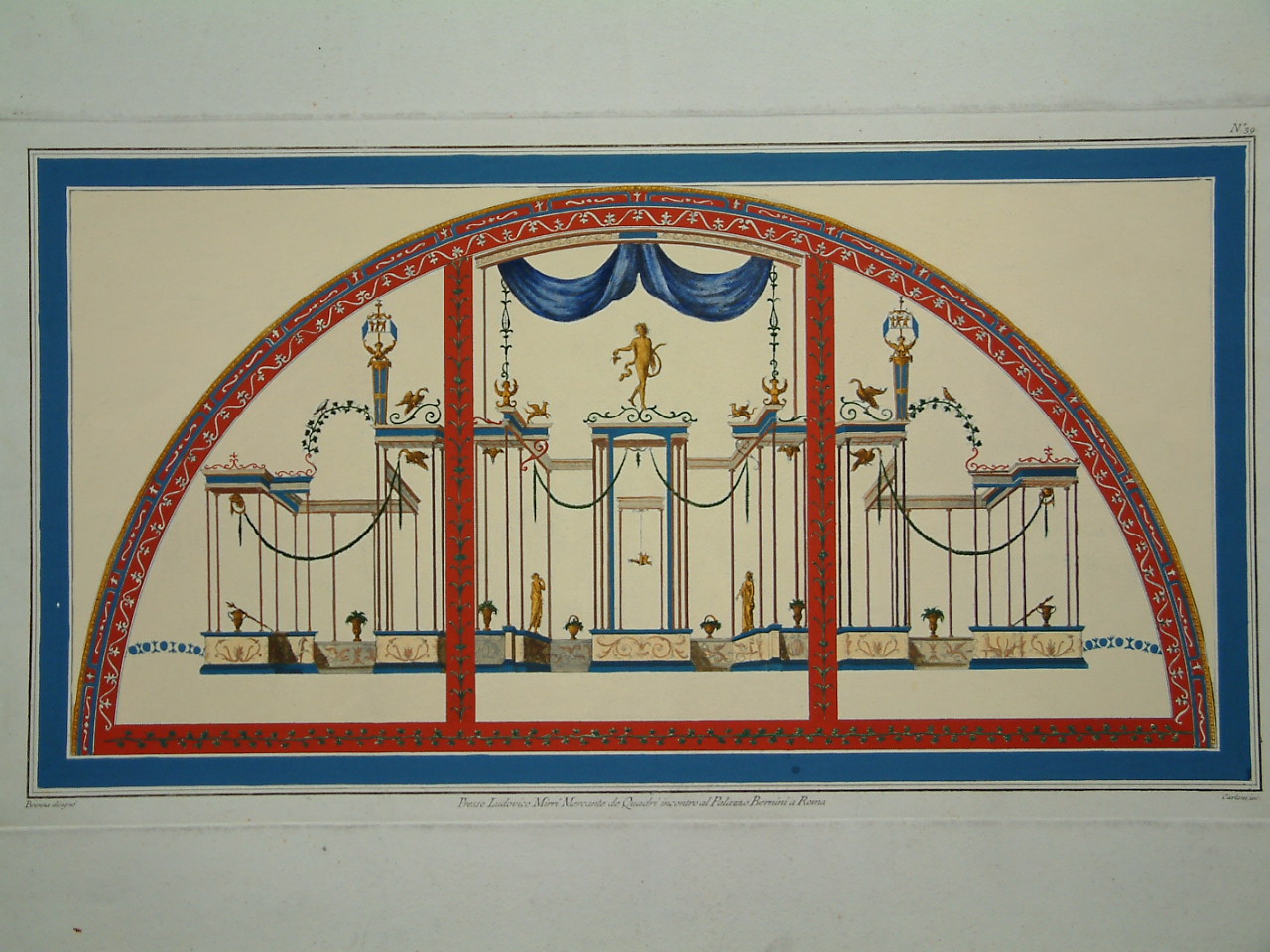 The ‘Vestigia della terme di Tito e loro interni pitture’ by Marco Carloni (1742-96) contains stunning plates illustrating the architectural features of Emperor Nero’s famous Domus Aurea. The emperor Titus had later built some baths on the site, hence the work’s title. The site had been known since the fifteenth century, but around 1774 the publisher Lodovico Mirri started re-excavating in the area with the express intention of selling engravings taken from the features of the Domus Aurea that he uncovered. The resulting album was published in plain and coloured issues. The latter is exceptionally rare. As Ricci explains, the engravings after Franciszek Smugliewicz and Vincenzo Brenna are in three groups. First, there is the frontispiece, title and two ground plans. The second group comprises twenty-five illustrations of ceiling decorations. Third, there are thirty-two plates showing the most important scenes painted on the ceilings, with elaborate grotesque borders. Berlin Katalog (1939) 3950; Cicognara (1931) 3796; Cohen de Ricci (1912) 814.