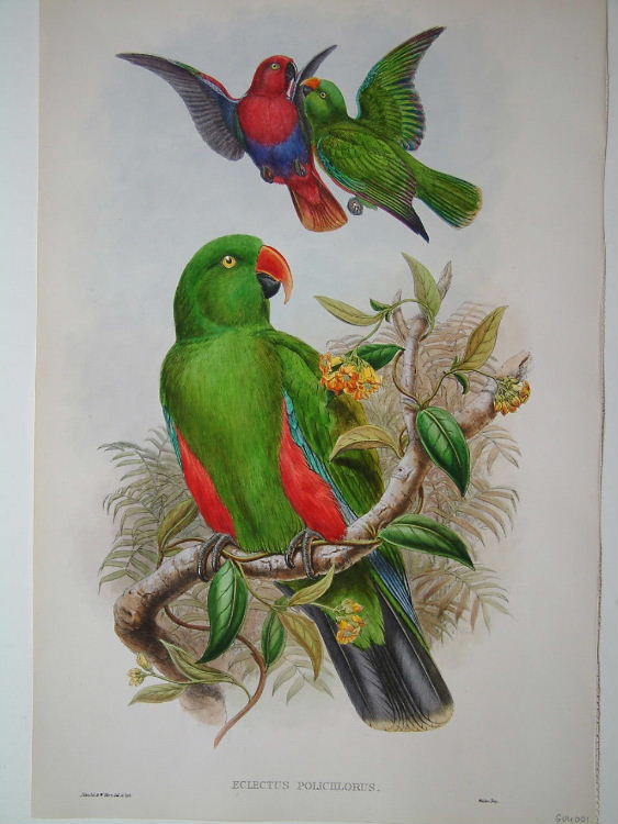 21 x 14 inches, original hand coloured lithograph. Plate 1, a parrot.
