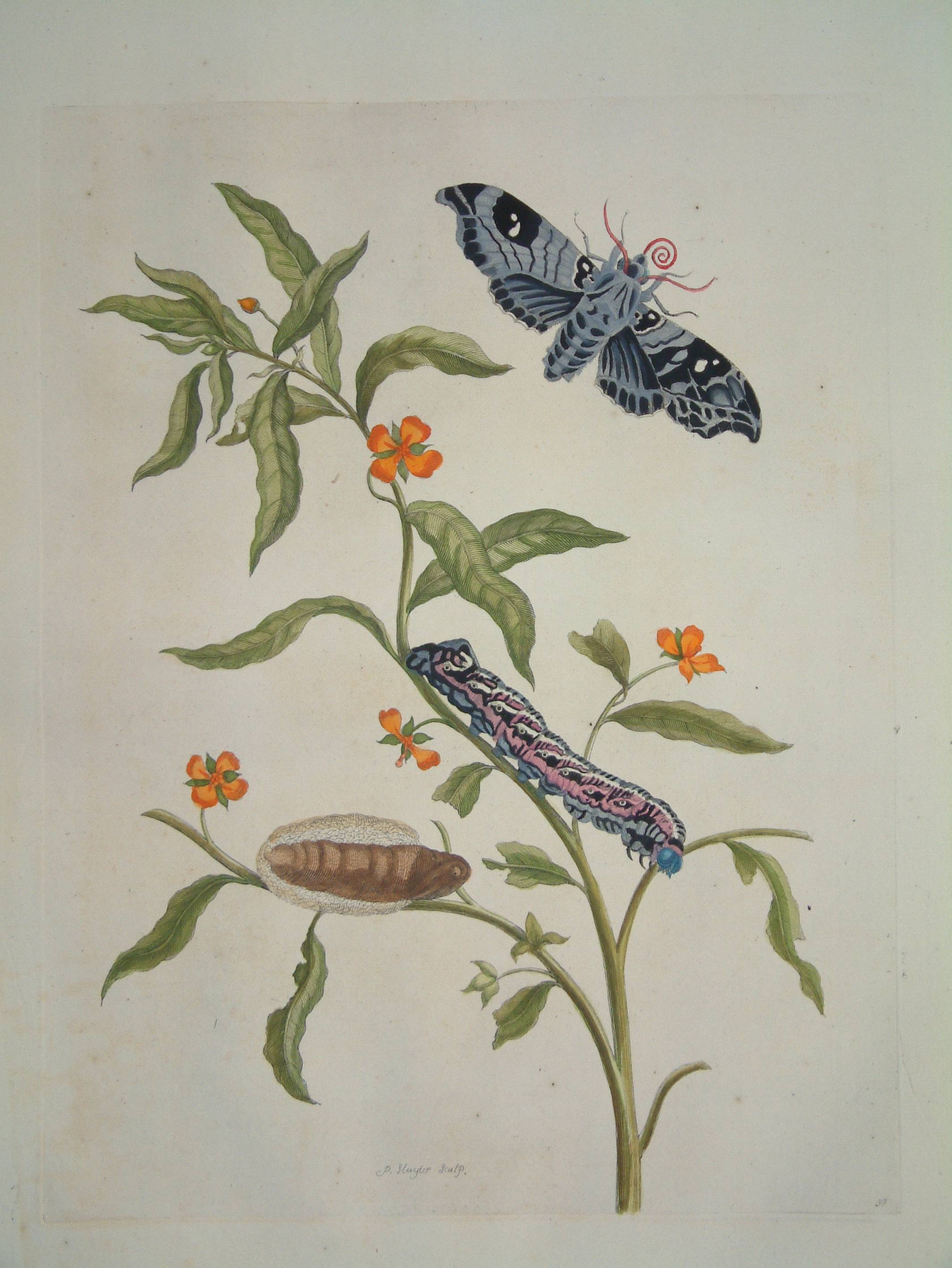 Maria Sibylla Merian (1647-1717) is most famous for two published works, the ‘Dissertatio de Generatione et Metamorphosibus Insectorum Surinamensium’ first published in 1705 and ‘De Europische Insecten’ of 1730, both published in Amsterdam. Maria was the daughter of Matthias Merian (1593-1650) a noted engraver and publisher. She devoted her life to the study of insects and their metamorphoses. Noting the fascinating insects returning from the Dutch colony in South America, she set sail with her daughter Dorothea in 1699 for Surinam where she remained until 1701. Her work was the first to show the European public the beauty and wealth of the insect life in the region. The various stages of caterpillar and butterfly are all shown amongst native flora and fruiting plants. The daughter Maria returned to Surinam to complete with work which was expanded with 12 further plates and published two years after her mother’s death in 1719. A third edition appeared in 1726. Dunthorne (1938) 205; ‘Great Flower Books’ (1956) p. 67; Hunt (1958) 467; Landwehr (1976) 131; Nissen (1966) 1341.