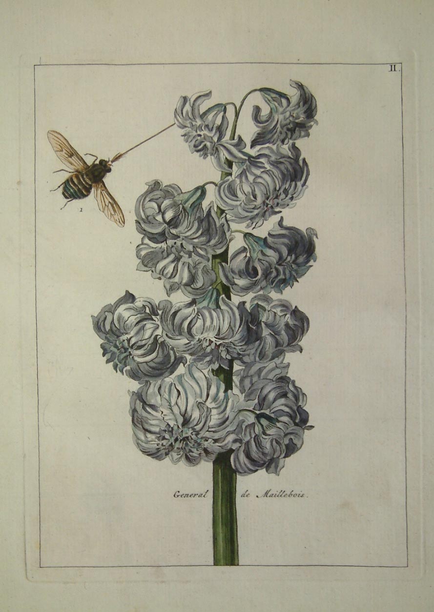 The publishers of the rare ‘Nederlandsche Bloemwerk’ were members of the society of Dutch nurserymen. The author of this work is unknown and it is usually listed under its title. The work was issued to subscribers, only 66 are named. Both Nissen and Plesch assign the engraving to Paul Theodor can Brussel (1754-95), though he signs only one plate. The bugs, caterpillars and moths are reminiscent of the work of Maria Sibylla Merian. Dunthorne (1938) 215; ‘Great Flower Books’ (1956) p. 47; Hunt (1958) 733; Landwehr (1976) 29; Nissen BBI (1966) 2219.