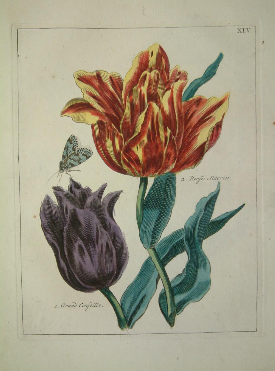 The publishers of the rare ‘Nederlandsche Bloemwerk’ were members of the society of Dutch nurserymen. The author of this work is unknown and it is usually listed under its title. The work was issued to subscribers, only 66 are named. Both Nissen and Plesch assign the engraving to Paul Theodor can Brussel (1754-95), though he signs only one plate. The bugs, caterpillars and moths are reminiscent of the work of Maria Sibylla Merian. Dunthorne (1938) 215; ‘Great Flower Books’ (1956) p. 47; Hunt (1958) 733; Landwehr (1976) 29; Nissen BBI (1966) 2219.