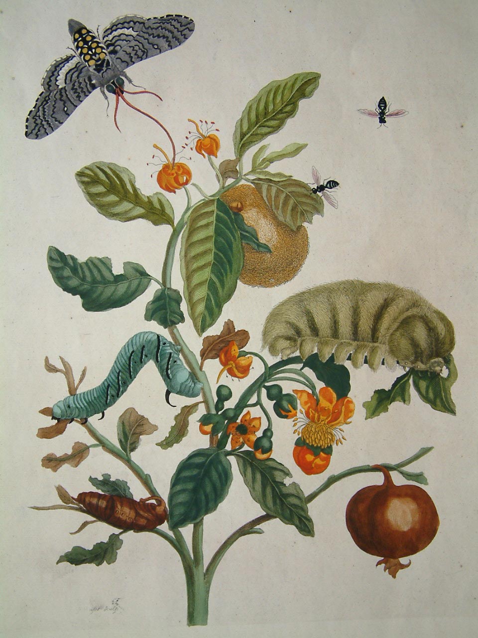 Maria Sibylla Merian (1647-1717) is most famous for two published works, the ‘Dissertatio de Generatione et Metamorphosibus Insectorum Surinamensium’ first published in 1705 and ‘De Europische Insecten’ of 1730, both published in Amsterdam. Maria was the daughter of Matthias Merian (1593-1650) a noted engraver and publisher. She devoted her life to the study of insects and their metamorphoses. Noting the fascinating insects returning from the Dutch colony in South America, she set sail with her daughter Dorothea in 1699 for Surinam where she remained until 1701. Her work was the first to show the European public the beauty and wealth of the insect life in the region. The various stages of caterpillar and butterfly are all shown amongst native flora and fruiting plants. The daughter Maria returned to Surinam to complete with work which was expanded with 12 further plates and published two years after her mother’s death in 1719. A third edition appeared in 1726. Dunthorne (1938) 205; ‘Great Flower Books’ (1956) p. 67; Hunt (1958) 467; Landwehr (1976) 131; Nissen (1966) 1341.