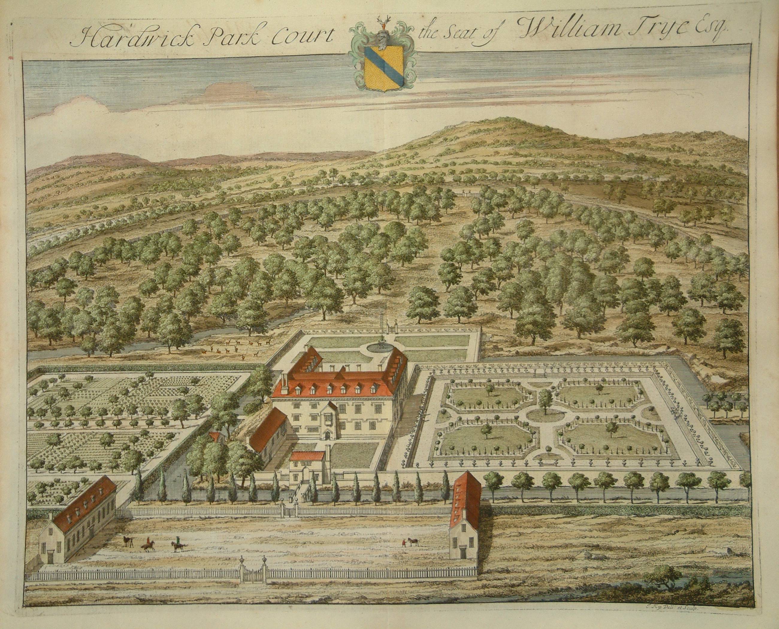 These classic engravings by Joannes Kip (1653-1722) illustrate Sir Robert Atkyns’ ‘Present State of Gloucestershire’ published in 1712. Atkyns (1647-1710) was a topographer and the son of the Chief Baron of the Exchequer. He was elected an MP for Gloucester in 1684. The superb birds-eye views are of country seats and estates and have become synonymous with the English country house. The book was published posthumously and nearly didn’t make it as many copies were destroyed in a fire at the printers in White Friars on 30 January 1712. Upcott (1968) I, p. 246.