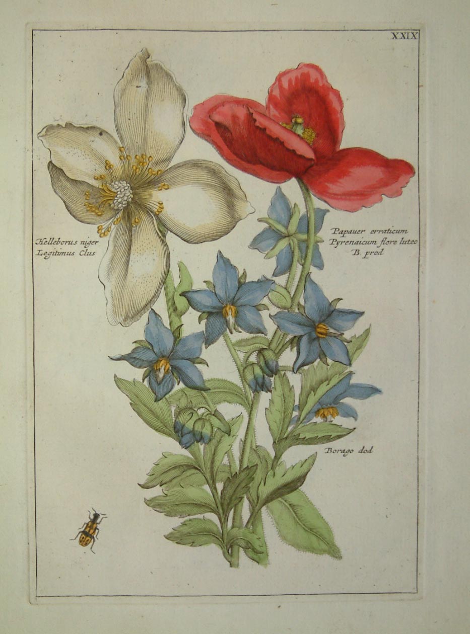 The publishers of the rare ‘Nederlandsche Bloemwerk’ were members of the society of Dutch nurserymen. The author of this work is unknown and it is usually listed under its title. The work was issued to subscribers, only 66 are named. Both Nissen and Plesch assign the engraving to Paul Theodor can Brussel (1754-95), though he signs only one plate. The bugs, caterpillars and moths are reminiscent of the work of Maria Sibylla Merian. Dunthorne (1938) 215; ‘Great Flower Books’ (1956) p. 47; Hunt (1958) 733; Landwehr (1976) 29; Nissen BBI (1966) 2219.