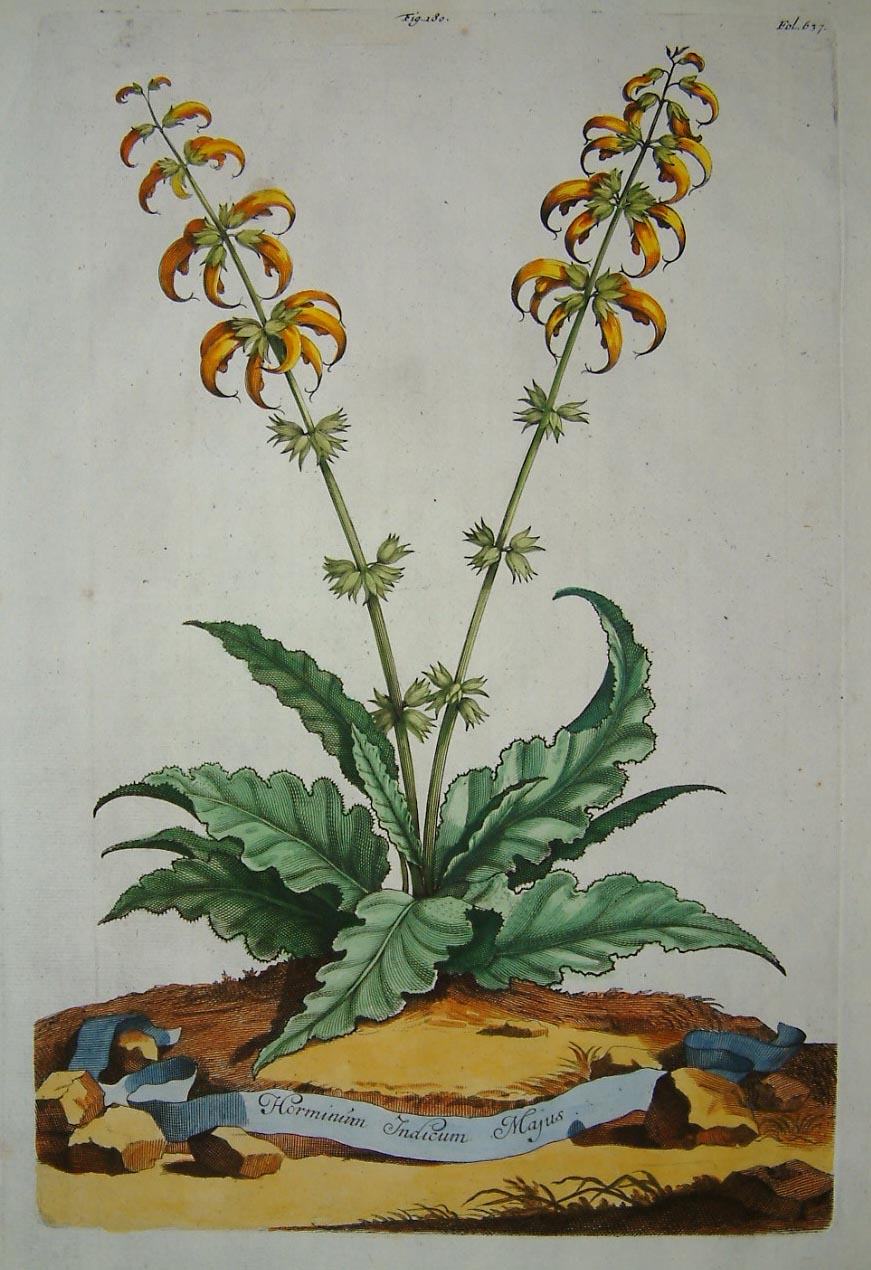 The author, Abraham Munting (1626-83), was an eminent professor of botany and chemistry at the University of Groningen. He travelled extensively and returning to Groningen he founded one of the most extensive botanical gardens of the time. Munting wrote several works but he is most known for his posthumous ‘Naauwkeurige Beschryving der Aardgewassen’ published in 1696. The stunning plates depict plants set in or floating above landscape gardens, a major break from the usual depictions to date. Hunt describes it as a weird and fascinating work: ‘The plates are as curious as their subjects. They commonly present the plants far larger than life, oranges huge as pumpkins, cyclamens with heavy corms floating lightly in mid-air, gently geraniums grown into giant trees. The effect is obtained through sketching in classical or idyllic or mountainous little landscapes below.’ The Latin names are present on scrolls and tablets. Hunt (1958) 404; Nissen BBI (1966) 1428; ‘Oak Spring Flora’ (1997) pp. 172-5.