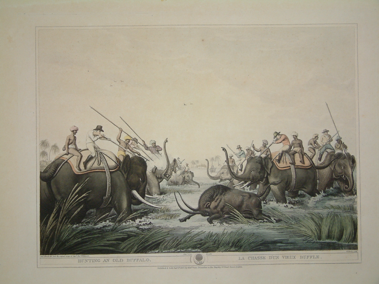 Captain Thomas Williamson (1790-1815) was an officer in the East India Company. Whilst serving in Bengal he practised his skill as an artist. These were then drawn upon by Samuel Howitt (1756/57-182) and published in the ‘Oriental Field Sports: being [a] complete, detailed and accurate Description of the Wild Sports of the East’, which is one of the great English colour plate books. The high-quality hand-coloured aquatint plates were first published in 1807. Howitt is highly regarded and in some circles is believed to be second only to Stubbs for his rendering of animals. Schwerdt calls it ‘e most beautiful book on Indian sport in existence’ and Prideaux ‘a faithful representation of [the] picturesque country, together with the manners and customs of both the native and European inhabitants’. Abbey Travel (1956) 427; Nissen BBI (1966) 4416; Prideaux p. 282; Schwerdt (1928-37) II p. 297; Tooley (1954) 508.