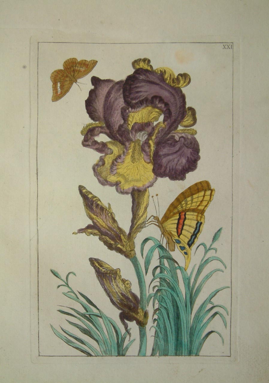 The publishers of the rare ‘Nederlandsche Bloemwerk’ were members of the society of Dutch nurserymen. The author of this work is unknown and it is usually listed under its title. The work was issued to subscribers, only 66 are named. Both Nissen and Plesch assign the engraving to Paul Theodor can Brussel (1754-95), though he signs only one plate. The bugs, caterpillars and moths are reminiscent of the work of Maria Sibylla Merian. Dunthorne (1938) 215; ‘Great Flower Books’ (1956) p. 47; Hunt (1958) 733; Landwehr (1976) 29; Nissen BBI (1966) 2219.