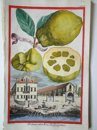 Johann Christoph Volkamer (1644-1720) was the son of Johann Georg Volkamer (1616-1693), physician, botanist, and gardener, who visited Italy and studied at Padua from 1638 to 1641, soon after the establishment of the botanic garden there. When he returned to Nuremberg, he built a large greenhouse in his garden at Gostenhof, the house and garden later inherited by his oldest son, Johann Christoph, who shared his father’s love of both Italy and gardening. During his youth he spent several years in Italy visiting gardens to study the endless varieties of citrus fruit he saw. The first part of the ‘Nurnbergische Hesperides’ was published in 1708 was a great success, the second volume came out in 1714. The views of Italian houses and gardens in this volume are mostly taken from the country round Venice, the Brenta, the Euganean hills and those near Bologna. The fruit and gardens in most of the plates spherical oranges, lemons, and citrons drifting like eccentric balloons above miniature landscapes make pleasingly surreal compositions. Its genesis is reflected in two albums of Volkamer’s drawings for it in the Germanisches Nationalmuseum, Nuremberg. About two hundred of these drawings have survived, and others were probably destroyed during World War II with parts of the family archive. Dunthorne (1938) 323; Hunt (1958) 420; Nissen BBI (1966) 2076; ‘Oak Spring Pomona’ (1990) pp.191-9. Pritzel (1871-77) 9848-9.