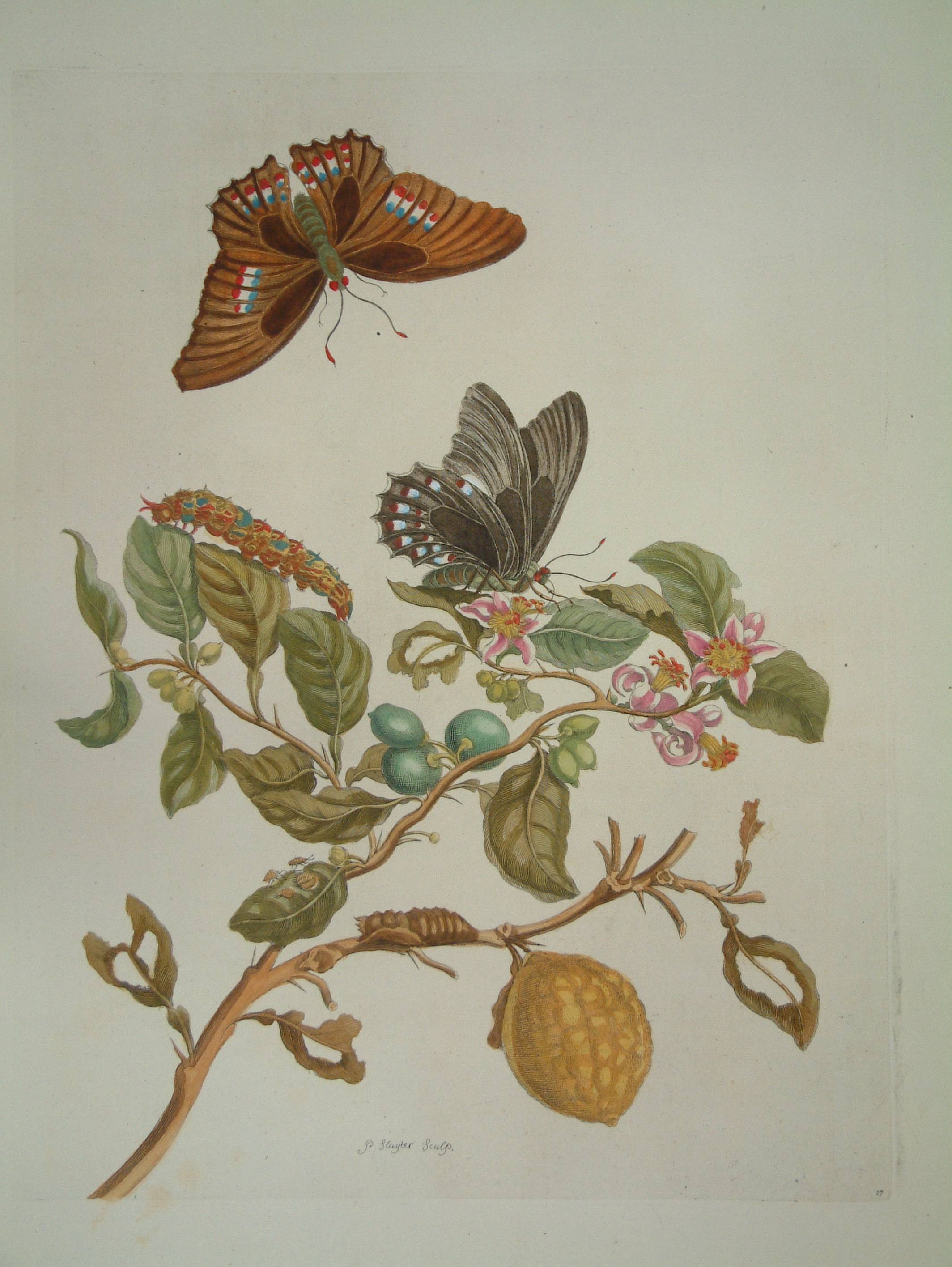 Maria Sibylla Merian (1647-1717) is most famous for two published works, the ‘Dissertatio de Generatione et Metamorphosibus Insectorum Surinamensium’ first published in 1705 and ‘De Europische Insecten’ of 1730, both published in Amsterdam. Maria was the daughter of Matthias Merian (1593-1650) a noted engraver and publisher. She devoted her life to the study of insects and their metamorphoses. Noting the fascinating insects returning from the Dutch colony in South America, she set sail with her daughter Dorothea in 1699 for Surinam where she remained until 1701. Her work was the first to show the European public the beauty and wealth of the insect life in the region. The various stages of caterpillar and butterfly are all shown amongst native flora and fruiting plants. The daughter Maria returned to Surinam to complete with work which was expanded with 12 further plates and published two years after her mother’s death in 1719. A third edition appeared in 1726. Dunthorne (1938) 205; ‘Great Flower Books’ (1956) p. 67; Hunt (1958) 467; Landwehr (1976) 131; Nissen (1966) 1341.