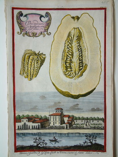 Johann Christoph Volkamer (1644-1720) was the son of Johann Georg Volkamer (1616-1693), physician, botanist, and gardener, who visited Italy and studied at Padua from 1638 to 1641, soon after the establishment of the botanic garden there. When he returned to Nuremberg, he built a large greenhouse in his garden at Gostenhof, the house and garden later inherited by his oldest son, Johann Christoph, who shared his father’s love of both Italy and gardening. During his youth he spent several years in Italy visiting gardens to study the endless varieties of citrus fruit he saw. The first part of the ‘Nurnbergische Hesperides’ was published in 1708 was a great success, the second volume came out in 1714. The views of Italian houses and gardens in this volume are mostly taken from the country round Venice, the Brenta, the Euganean hills and those near Bologna. The fruit and gardens in most of the plates spherical oranges, lemons, and citrons drifting like eccentric balloons above miniature landscapes make pleasingly surreal compositions. Its genesis is reflected in two albums of Volkamer’s drawings for it in the Germanisches Nationalmuseum, Nuremberg. About two hundred of these drawings have survived, and others were probably destroyed during World War II with parts of the family archive. Dunthorne (1938) 323; Hunt (1958) 420; Nissen BBI (1966) 2076; ‘Oak Spring Pomona’ (1990) pp.191-9. Pritzel (1871-77) 9848-9.