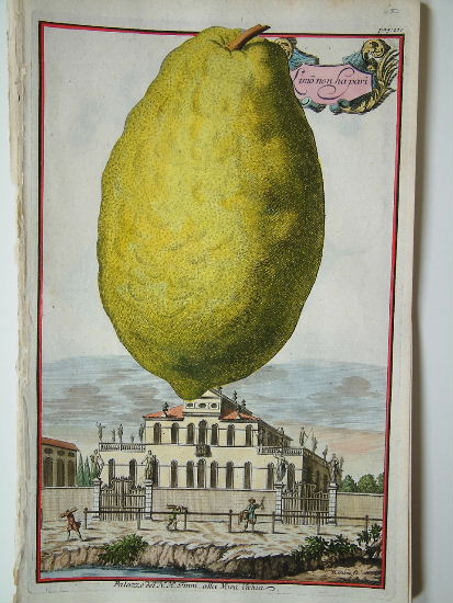 Johann Christoph Volkamer (1644-1720) was the son of Johann Georg Volkamer (1616-1693), physician, botanist, and gardener, who visited Italy and studied at Padua from 1638 to 1641, soon after the establishment of the botanic garden there. When he returned to Nuremberg, he built a large greenhouse in his garden at Gostenhof, the house and garden later inherited by his oldest son, Johann Christoph, who shared his father’s love of both Italy and gardening. During his youth he spent several years in Italy visiting gardens to study the endless varieties of citrus fruit he saw. The first part of the ‘Nurnbergische Hesperides’ was published in 1708 was a great success, the second volume came out in 1714. The views of Italian houses and gardens in this volume are mostly taken from the country round Venice, the Brenta, the Euganean hills and those near Bologna. The fruit and gardens in most of the plates spherical oranges, lemons, and citrons drifting like eccentric balloons above miniature landscapes make pleasingly surreal compositions. Its genesis is reflected in two albums of Volkamer’s drawings for it in the Germanisches Nationalmuseum, Nuremberg. About two hundred of these drawings have survived, and others were probably destroyed during World War II with parts of the family archive. Dunthorne (1938) 323; Hunt (1958) 420; Nissen BBI (1966) 2076; ‘Oak Spring Pomona’ (1990) pp.191-9. Pritzel (1871-77) 9848-9.