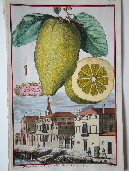 Johann Christoph Volkamer (1644-1720) was the son of Johann Georg Volkamer (1616-1693), physician, botanist, and gardener, who visited Italy and studied at Padua from 1638 to 1641, soon after the establishment of the botanic garden there. When he returned to Nuremberg, he built a large greenhouse in his garden at Gostenhof, the house and garden later inherited by his oldest son, Johann Christoph, who shared his father’s love of both Italy and gardening. During his youth he spent several years in Italy visiting gardens to study the endless varieties of citrus fruit he saw. The first part of the ‘Nurnbergische Hesperides’ was published in 1708 was a great success, the second volume came out in 1714. The views of Italian houses and gardens in this volume are mostly taken from the country round Venice, the Brenta, the Euganean hills and those near Bologna. The fruit and gardens in most of the plates spherical oranges, lemons, and citrons drifting like eccentric balloons above miniature landscapes make pleasingly surreal compositions. Its genesis is reflected in two albums of Volkamer’s drawings for it in the Germanisches Nationalmuseum, Nuremberg. About two hundred of these drawings have survived, and others were probably destroyed during World War II with parts of the family archive. Dunthorne (1938) 323; Hunt (1958) 420; Nissen BBI (1966) 2076; ‘Oak Spring Pomona’ (1990) pp.191-9. Pritzel (1871-77) 9848-9.