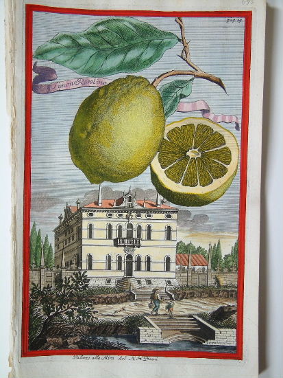 Johann Christoph Volkamer (1644-1720) was the son of Johann Georg Volkamer (1616-1693), physician, botanist, and gardener, who visited Italy and studied at Padua from 1638 to 1641, soon after the establishment of the botanic garden there. When he returned to Nuremberg, he built a large greenhouse in his garden at Gostenhof, the house and garden later inherited by his oldest son, Johann Christoph, who shared his father’s love of both Italy and gardening. During his youth he spent several years in Italy visiting gardens to study the endless varieties of citrus fruit he saw. The first part of the ‘Nurnbergische Hesperides’ was published in 1708 was a great success, the second volume came out in 1714. The views of Italian houses and gardens in this volume are mostly taken from the country round Venice, the Brenta, the Euganean hills and those near Bologna. The fruit and gardens in most of the plates spherical oranges, lemons, and citrons drifting like eccentric balloons above miniature landscapes make pleasingly surreal compositions. Its genesis is reflected in two albums of Volkamer’s drawings for it in the Germanisches Nationalmuseum, Nuremberg. About two hundred of these drawings have survived, and others were probably destroyed during World War II with parts of the family archive. Dunthorne (1938) 323; Hunt (1958) 420; Nissen BBI (1966) 2076; ‘Oak Spring Pomona’ (1990) pp.191-9. Pritzel (1871-77) 9848-9.