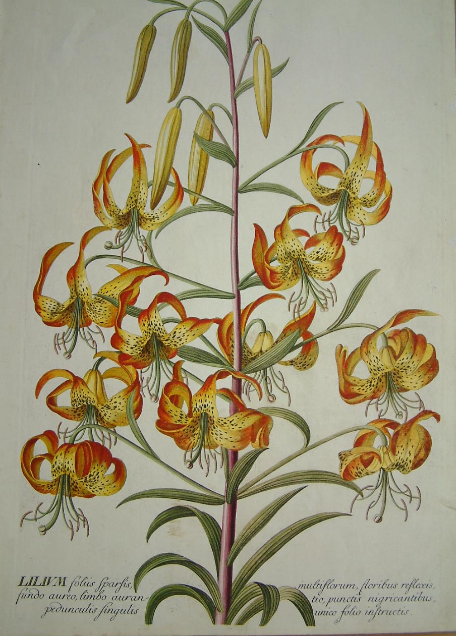 Christoph Jacob Trew (1695-1769) was a wealthy physician and noted bibliophile. The artist George Dionysius Ehret (1708-70) enjoyed the lifelong patronage of Trew and they became great friends. It was Trew who encouraged Ehret to study the plants from a scientific perspective as well as an artistic one. Trew supported the publication of the ‘Plantae Selectae’ from 1750 for which he supplied the descriptions, it has been called ‘one of the greatest eighteenth century botanical books published’ (De Belder) and is distinguished by its gold titles. Hunt states that Ehret’s illustrations ‘achieve realism, majesty, ineffable colour, all in one breathtaking look’. The ‘Hortus Nitidissimus’ was called “the most sumptuous of the florilegia” in the De Belder catalogue. Trew intended the book to be a magnificent ‘gallery of the most colourful and ravishing flowers that could be grown in Europe’. Like the ‘Plantae Selectae’ being published at the same time, many of the plates are the work of Ehret. Here however, he concentrates on displaying the flowers at their full beauty. De Belder (1987) 362-3; Dunthorne 309 & 310; ‘Great Flower Books’ (1956) p. 78; Hunt (1958) 539; Nissen BBI (1966) 1995 & 1997.