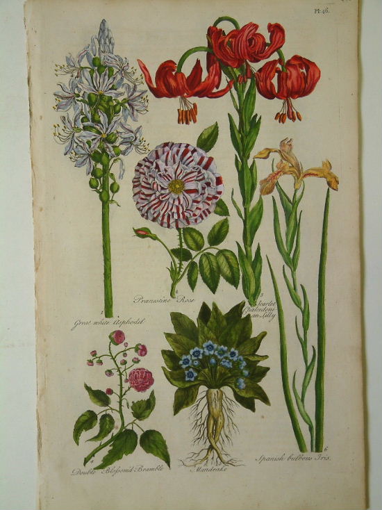 John Hill (1716-75) was trained as a pharmacist and then became a gardener and curator of dried plants for the Duke of Richmond. He left to become an actor before opening up a pharmacy in Covent Garden. He then translated a treatise on mineralogy which finally brought him a degree of financial security and a calling. He became a writer of many subjects, his most impressive being the twenty-six volume ‘Vegetable System’ for which he personally designed and etched 1,600 plates. Hill also worked on the ground breaking for Kew Gardens and as a gardener at Kensington Palace. Hill is noted for introducing the Linnaean system of botanical nomenclature to England. This is from the ‘Eden, or a Compleat Body of Gardening’ which is arranged as a calendar week by week beginning at the end of August. Dunthorne (1938) 129; Henery (1975) no. 805; Hunt (1958) 559; Nissen ZBI (1978) 880; ‘Oak Spring Flora’ (1997) pp. 197-201; Sitwell & Blunt (1956) p. 59.