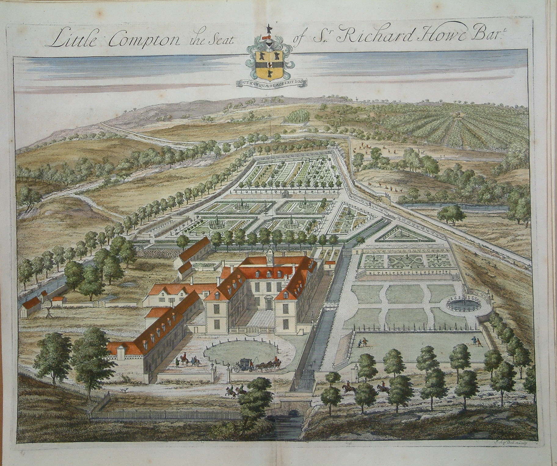 These classic engravings by Joannes Kip (1653-1722) illustrate Sir Robert Atkyns’ ‘Present State of Gloucestershire’ published in 1712. Atkyns (1647-1710) was a topographer and the son of the Chief Baron of the Exchequer. He was elected an MP for Gloucester in 1684. The superb birds-eye views are of country seats and estates and have become synonymous with the English country house. The book was published posthumously and nearly didn’t make it as many copies were destroyed in a fire at the printers in White Friars on 30 January 1712. Upcott (1968) I, p. 246.