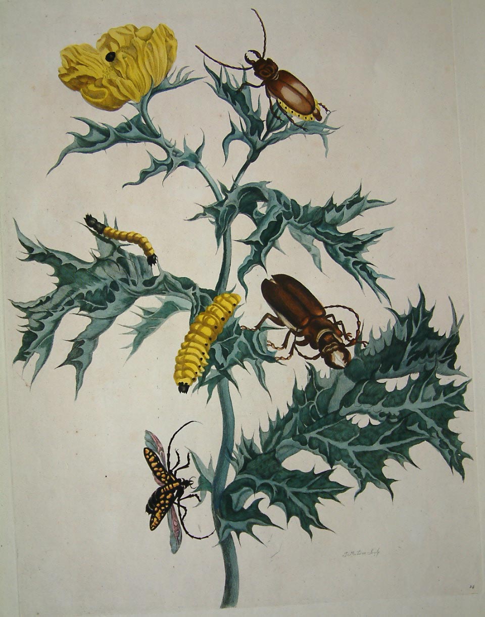 Maria Sibylla Merian (1647-1717) is most famous for two published works, the ‘Dissertatio de Generatione et Metamorphosibus Insectorum Surinamensium’ first published in 1705 and ‘De Europische Insecten’ of 1730, both published in Amsterdam. Maria was the daughter of Matthias Merian (1593-1650) a noted engraver and publisher. She devoted her life to the study of insects and their metamorphoses. Noting the fascinating insects returning from the Dutch colony in South America, she set sail with her daughter Dorothea in 1699 for Surinam where she remained until 1701. Her work was the first to show the European public the beauty and wealth of the insect life in the region. The various stages of caterpillar and butterfly are all shown amongst native flora and fruiting plants. The daughter Maria returned to Surinam to complete with work which was expanded with 12 further plates and published two years after her mother’s death in 1719. A third edition appeared in 1726. Dunthorne (1938) 205; ‘Great Flower Books’ (1956) p. 67; Hunt (1958) 467; Landwehr (1976) 131; Nissen (1966) 1341.