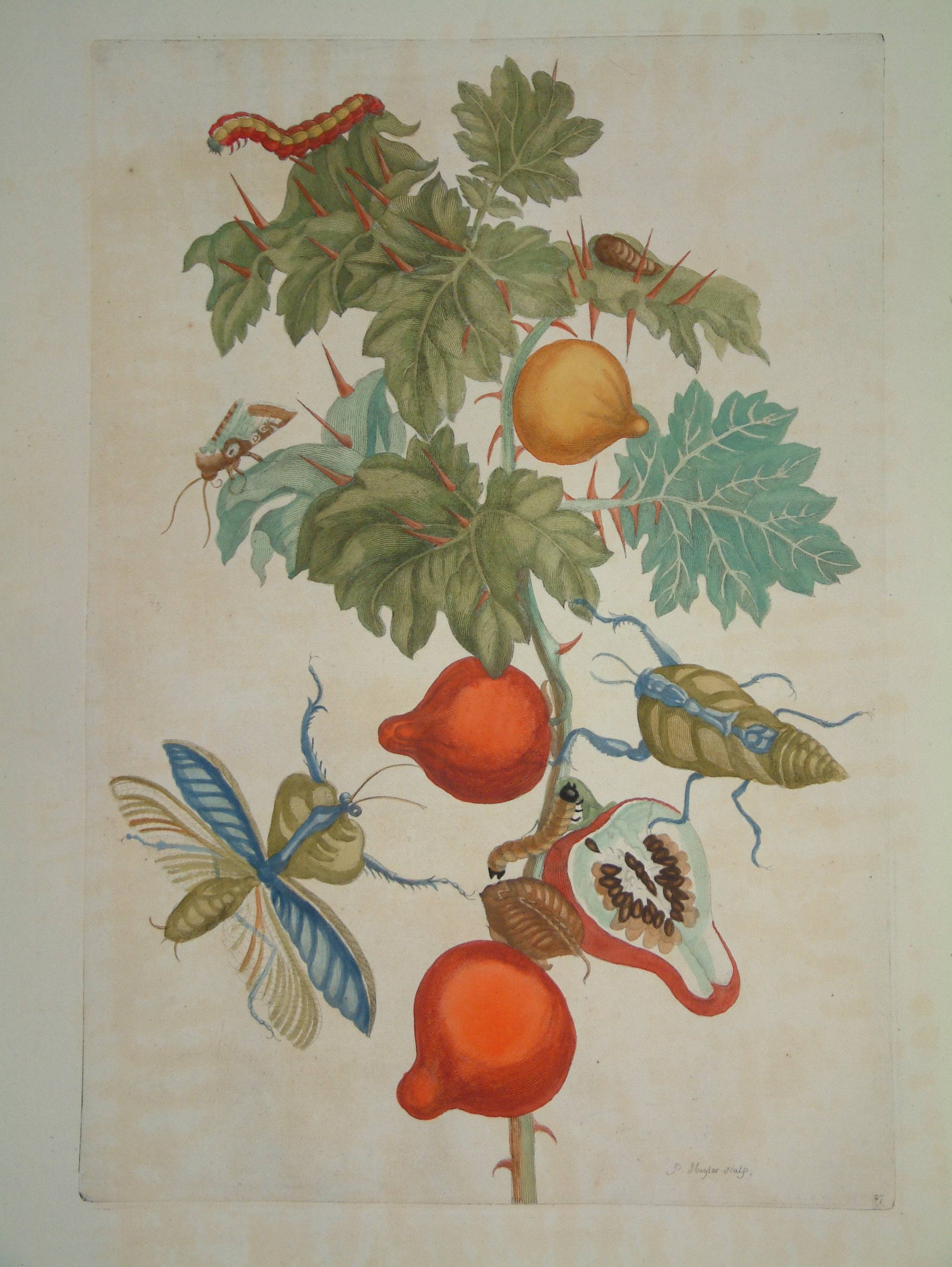 Maria Sibylla Merian (1647-1717) is most famous for two published works, the ‘Dissertatio de Generatione et Metamorphosibus Insectorum Surinamensium’ first published in 1705 and ‘De Europische Insecten’ of 1730, both published in Amsterdam. Maria was the daughter of Matthias Merian (1593-1650) a noted engraver and publisher. She devoted her life to the study of insects and their metamorphoses. Noting the fascinating insects returning from the Dutch colony in South America, she set sail with her daughter Dorothea in 1699 for Surinam where she remained until 1701. Her work was the first to show the European public the beauty and wealth of the insect life in the region. The various stages of caterpillar and butterfly are all shown amongst native flora and fruiting plants. The daughter Maria returned to Surinam to complete with work which was expanded with 12 further plates and published two years after her mother’s death in 1719. A third edition appeared in 1726. Dunthorne (1938) 205; ‘Great Flower Books’ (1956) p. 67; Hunt (1958) 467; Landwehr (1976) 131; Nissen (1966) 1341.