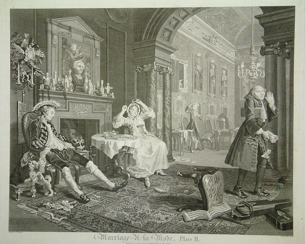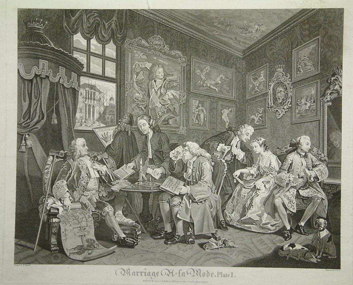 William Hogarth (1697-1764) is ‘considered to be the father of English caricature’ (Feaver). Hogarth began life in the hardest of ways with four years spent with his family in Fleet Prison; his father being a bankrupt teacher from the north of England. Aged seventeen he was apprenticed to a silver engraver before setting up as an engraver of trade cards. His free style of engraving which was his fresh perspective on the world around him found few admirers in the traditional markets. He took to subscription to reach a wider audience producing such classic series as “Marriage a la Mode”, “The Rake’s Progress”, “Industry and Idleness” amongst others. Despite his own highly inflaming political prints it was parliament which eventually granted his wish of a copyright law protecting the works of artists such as himself. John and Josiah Boydell later collected the drawing into the ‘Original Works of William Hogarth’, first published in 1790. Clayton (1997); Feaver (1988).