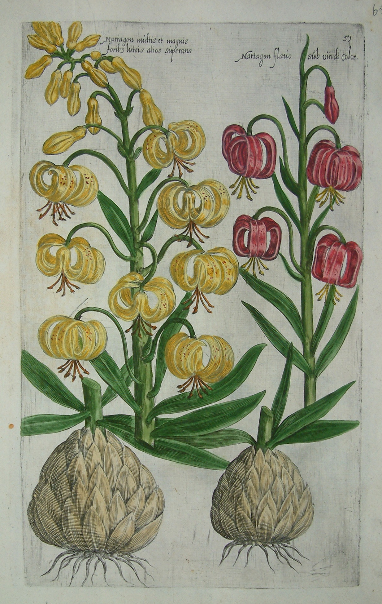 Emanuel Sweert (1552-1612) was an artist and a dealer in object d’art in Amsterdam and carried amongst his stock rare and curious plants. At the time rare flowers were highly collected and his artistic skills enabled this work to come to fruition. The ‘Florilegium Amplissimum et Selectissimum’ was originally published as a working catalogue. It was in two parts, the first devoted to bulbous plants with the second to various other plants. It is one of the most attractive and popular of the early Florilegia. Sweert corresponded widely with other botanists and there is even a white iris named after him – Iris sweertii. Not in Dunthorne; Hunt (1958) 196; Nissen BBI (1966) 1920; ‘Oak Spring Flora’ (1997) p. 43.
