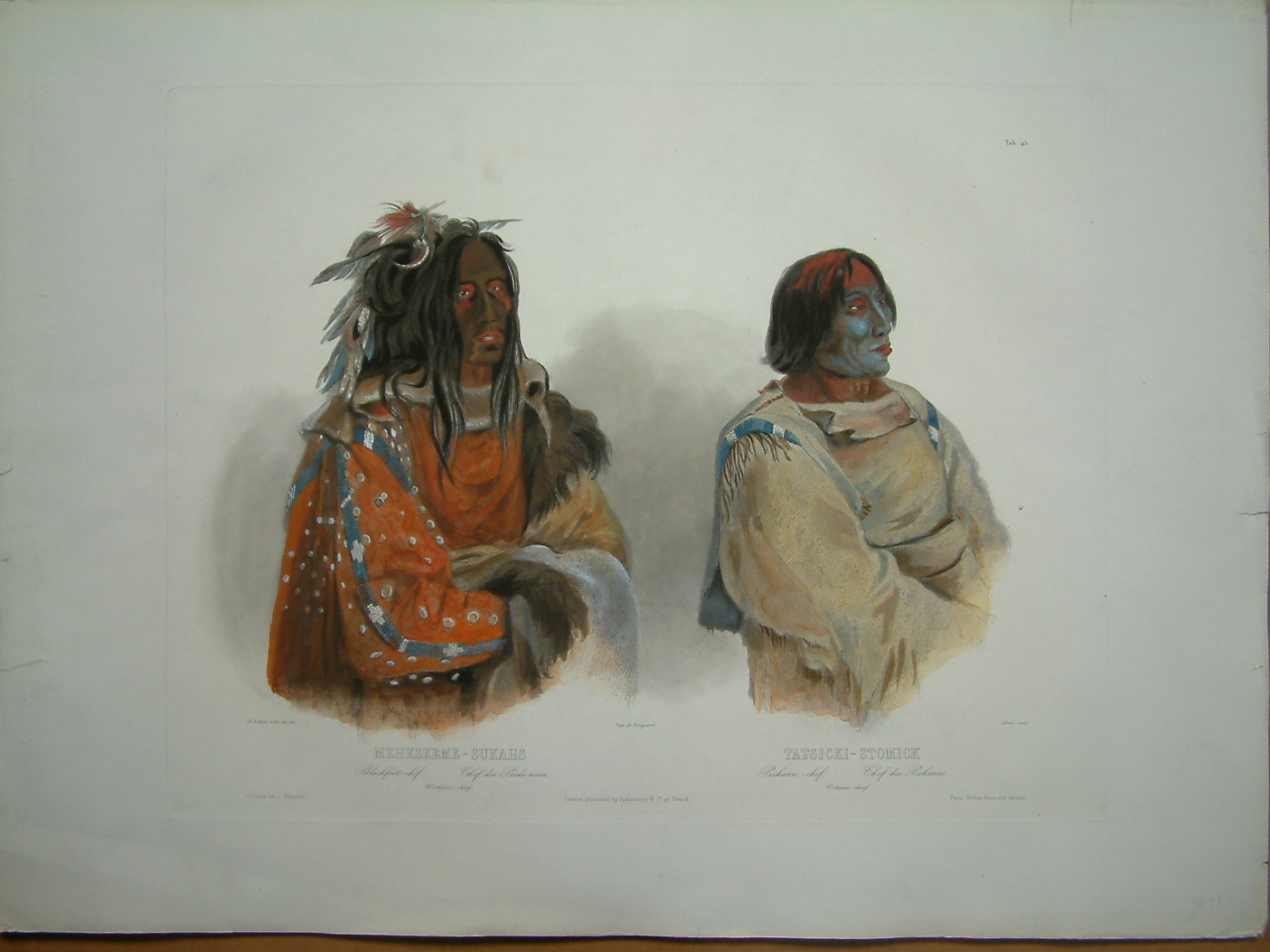 This is undoubtedly the finest plate book on Native American Indians ever published. The artist Karl Bodmer (1809-93) went on the expedition of Prince Maximilian to the Plains of North America. They travelled up the Missouri River from St. Louis passing the forts of the American Fur Company. The Sioux were one of the first they encountered recording their ceremonial dances. They continued by steamer to Fort Clark studying along the way the life of the Mandan, Mintari and Crow tribes. At Fort Union they encountered the Cree and Assiniboin. This was the main base of the American Fur Company. They then proceeded through the geological beauty of the next section of the Missouri to Fort Mackenzie in present day Montana, where they spent a month building relationships with the fearsome Blackfoot tribe. As winter was setting in this was their turning point and the return journey was made downstream. The finished prints accompanied the text of Maximilian and was published as ‘Reise in das Innere Nord-America’. The quality of the engraving and the realism of the individual portraits are praised to the highest degree. Abbey ‘Travel’ (1956) 615; Howes (1962) M443a; Sabin (1868-1936) 47015; Wagner-Camp (1982) 76.2.