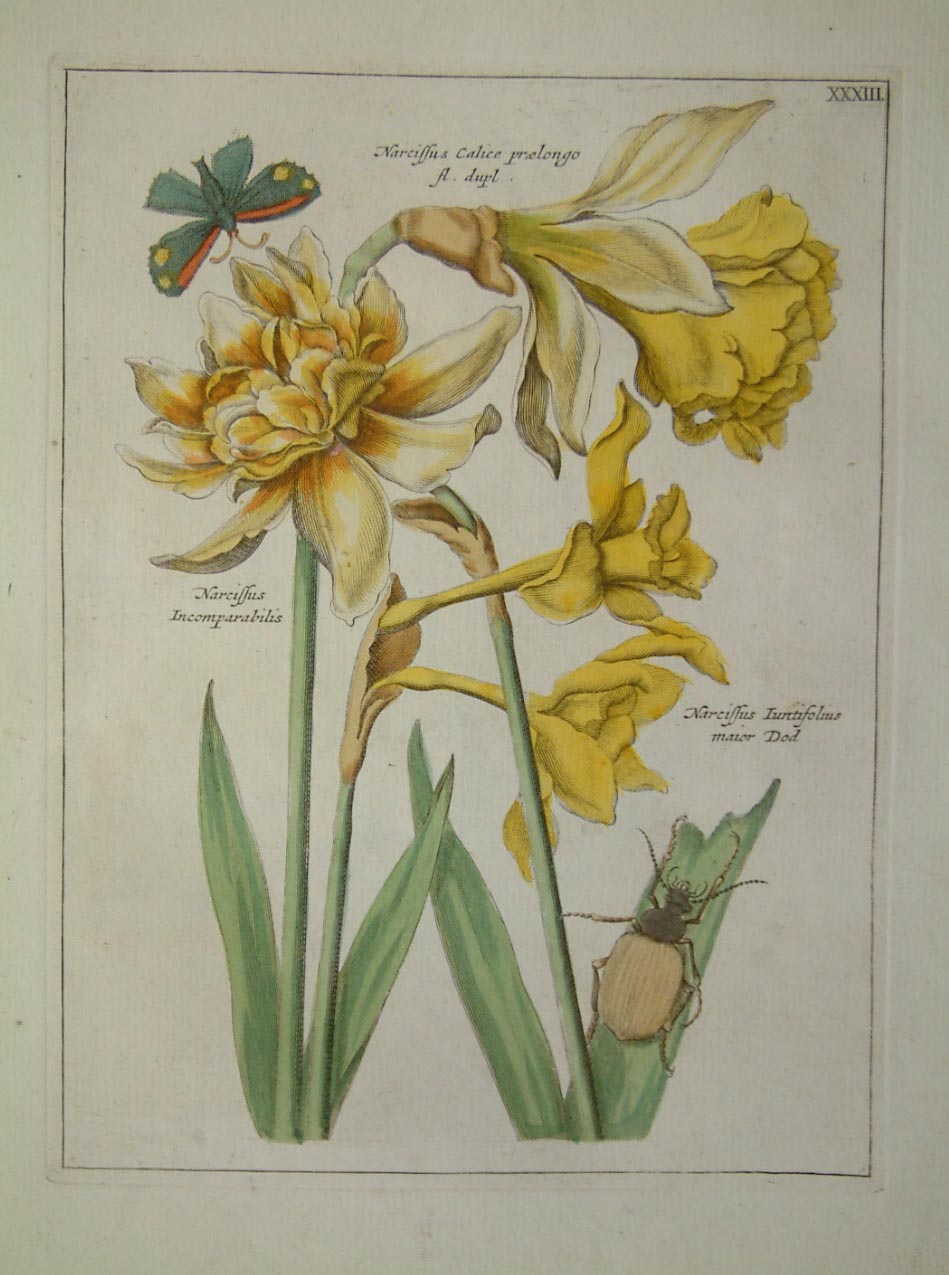 The publishers of the rare ‘Nederlandsche Bloemwerk’ were members of the society of Dutch nurserymen. The author of this work is unknown and it is usually listed under its title. The work was issued to subscribers, only 66 are named. Both Nissen and Plesch assign the engraving to Paul Theodor can Brussel (1754-95), though he signs only one plate. The bugs, caterpillars and moths are reminiscent of the work of Maria Sibylla Merian. Dunthorne (1938) 215; ‘Great Flower Books’ (1956) p. 47; Hunt (1958) 733; Landwehr (1976) 29; Nissen BBI (1966) 2219.