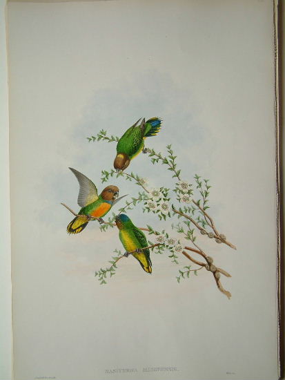 John Gould was born in Lyme, England in 1804, the son of a gardener. With no formal education at the age of 14, he followed his father into the same trade. In his spare time, he learnt how to preserve and mount specimens and traded some of them with the scholars at nearby Eton College. After a short time as a gardener in Yorkshire he settled in London as a taxidermist. In 1827 he received a position at the Zoological Society as curator. His first book on the birds of the Himalayas was published in 1832 when he was just 26 years old. Gould employed the new technology of lithography, his wife Elizabeth being responsible for the lithographic illustrations and the drawings onto stone. He became a Fellow of the Royal Society and Vice President of the Zoological Society. ‘In the field of natural history, the accomplishments of John Gould in his 76 years of life from 1804 to 1881 are truly monumental. No other ornithologist has ever exceeded the number of Gould’s bird discoveries and the magnitude and splendour of his folio publications.’ (Sauer).
