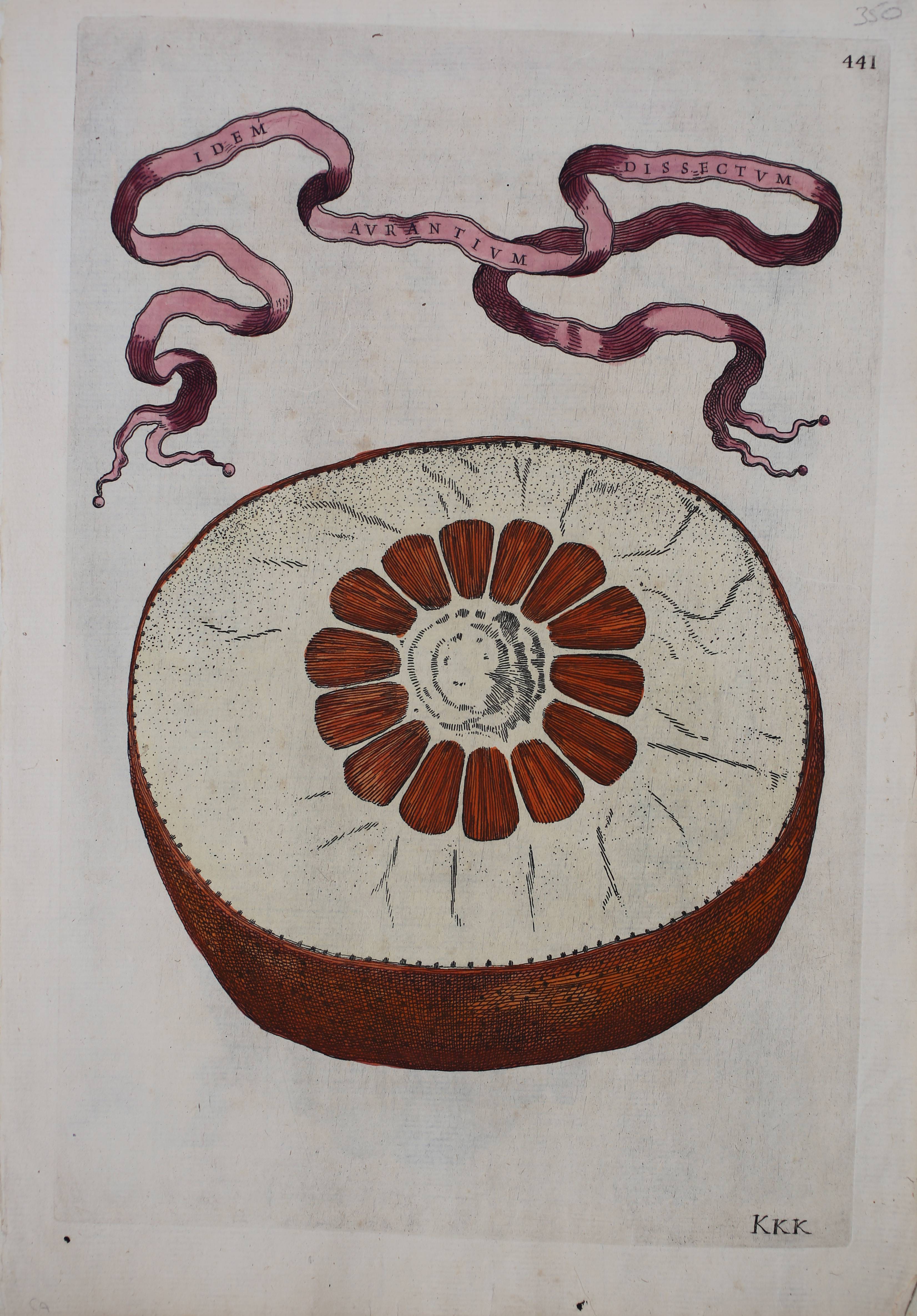 Giovanni Battista Ferrari (1584-1655) was born in Siena, became a Jesuit and taught Hebrew in a seminary in Rome for much of his life. His assion for gardening was first seen in the ‘De Florum’ published in 1633. The ‘Hesperides sive de Malorum’ published in 1646 is the first book entirely devoted to citrus fruit. Many of the plates are the work of the artist and engraver Cornelis Bloemart (1603-92), apprenticed to Crispin de Passe. The varietal names are written in elaborate ribbons. De Belder (1987) 124, Hunt (1958) 243; Nissen BBI (1966) 621; ‘Oak Spring Pomona’ (1990) pp.177-80.