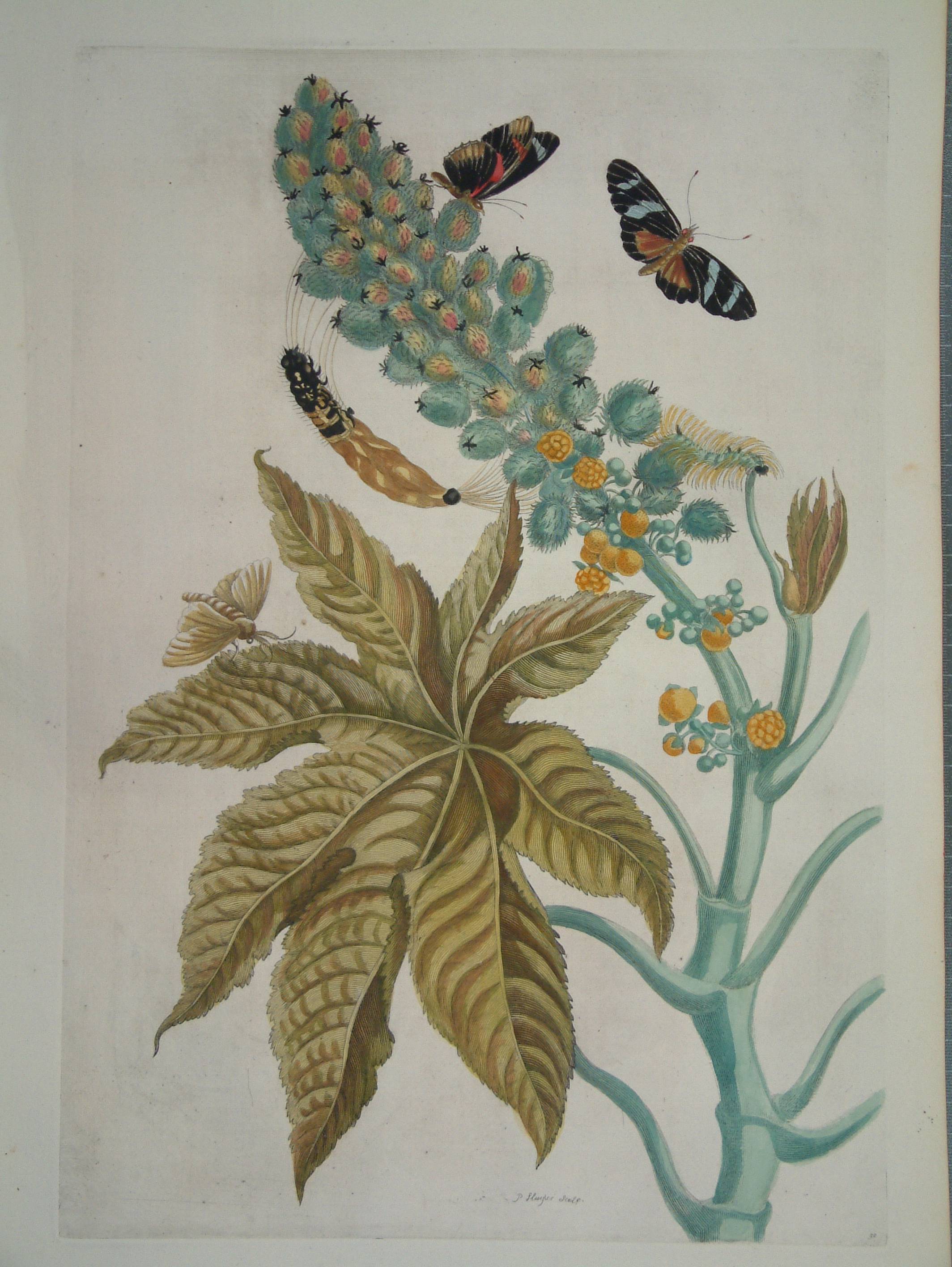 Maria Sibylla Merian (1647-1717) is most famous for two published works, the ‘Dissertatio de Generatione et Metamorphosibus Insectorum Surinamensium’ first published in 1705 and ‘De Europische Insecten’ of 1730, both published in Amsterdam. Maria was the daughter of Matthias Merian (1593-1650) a noted engraver and publisher. She devoted her life to the study of insects and their metamorphoses. Noting the fascinating insects returning from the Dutch colony in South America, she set sail with her daughter Dorothea in 1699 for Surinam where she remained until 1701. Her work was the first to show the European public the beauty and wealth of the insect life in the region. The various stages of caterpillar and butterfly are all shown amongst native flora and fruiting plants. The daughter Maria returned to Surinam to complete with work which was expanded with 12 further plates and published two years after her mother’s death in 1719. A third edition appeared in 1726. Dunthorne (1938) 205; ‘Great Flower Books’ (1956) p. 67; Hunt (1958) 467; Landwehr (1976) 131; Nissen (1966) 1341.