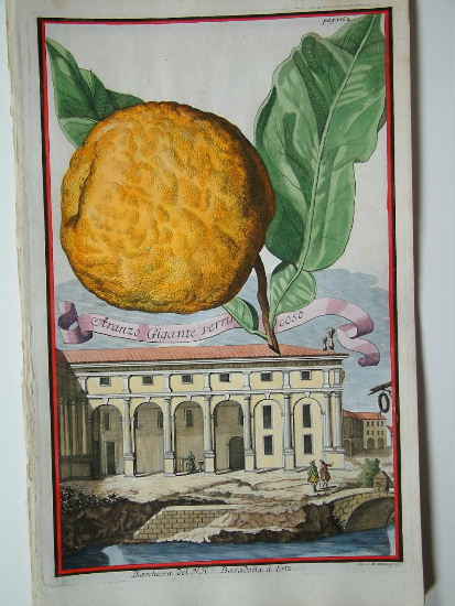 Johann Christoph Volkamer (1644-1720) was the son of Johann Georg Volkamer (1616-1693), physician, botanist, and gardener, who visited Italy and studied at Padua from 1638 to 1641, soon after the establishment of the botanic garden there. When he returned to Nuremberg, he built a large greenhouse in his garden at Gostenhof, the house and garden later inherited by his oldest son, Johann Christoph, who shared his father’s love of both Italy and gardening. During his youth he spent several years in Italy visiting gardens to study the endless varieties of citrus fruit he saw. The first part of the ‘Nurnbergische Hesperides’ was published in 1708 was a great success, the second volume came out in 1714. The views of Italian houses and gardens in this volume are mostly taken from the country round Venice, the Brenta, the Euganean hills and those near Bologna. The fruit and gardens in most of the plates spherical oranges, lemons, and citrons drifting like eccentric balloons above miniature landscapes make pleasingly surreal compositions. Its genesis is reflected in two albums of Volkamer’s drawings for it in the Germanisches Nationalmuseum, Nuremberg. About two hundred of these drawings have survived, and others were probably destroyed during World War II with parts of the family archive. Dunthorne (1938) 323; Hunt (1958) 420; Nissen BBI (1966) 2076; ‘Oak Spring Pomona’ (1990) pp.191-9. Pritzel (1871-77) 9848-9.
