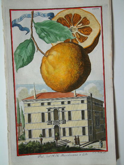 Johann Christoph Volkamer (1644-1720) was the son of Johann Georg Volkamer (1616-1693), physician, botanist, and gardener, who visited Italy and studied at Padua from 1638 to 1641, soon after the establishment of the botanic garden there. When he returned to Nuremberg, he built a large greenhouse in his garden at Gostenhof, the house and garden later inherited by his oldest son, Johann Christoph, who shared his father’s love of both Italy and gardening. During his youth he spent several years in Italy visiting gardens to study the endless varieties of citrus fruit he saw. The first part of the ‘Nurnbergische Hesperides’ was published in 1708 was a great success, the second volume came out in 1714. The views of Italian houses and gardens in this volume are mostly taken from the country round Venice, the Brenta, the Euganean hills and those near Bologna. The fruit and gardens in most of the plates – spherical oranges, lemons, and citrons drifting like eccentric balloons above miniature landscapes – make pleasingly surreal compositions. Its genesis is reflected in two albums of Volkamer’s drawings for it in the Germanisches Nationalmuseum, Nuremberg. About two hundred of these drawings have survived, and others were probably destroyed during World War II with parts of the family archive. Dunthorne (1938) 323; Hunt (1958) 420; Nissen BBI (1966) 2076; ‘Oak Spring Pomona’ (1990) pp.191-9. Pritzel (1871-77) 9848-9.