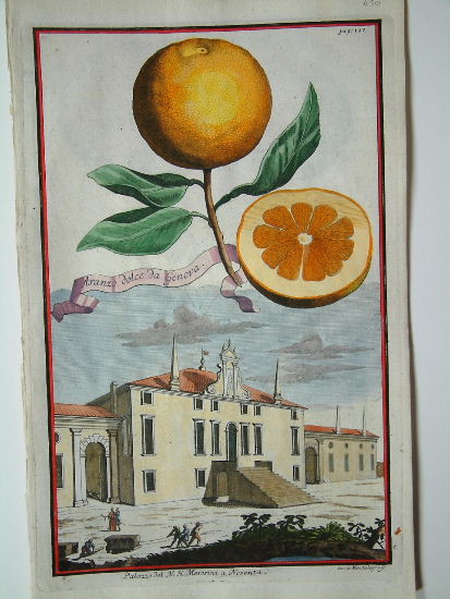 Johann Christoph Volkamer (1644-1720) was the son of Johann Georg Volkamer (1616-1693), physician, botanist, and gardener, who visited Italy and studied at Padua from 1638 to 1641, soon after the establishment of the botanic garden there. When he returned to Nuremberg, he built a large greenhouse in his garden at Gostenhof, the house and garden later inherited by his oldest son, Johann Christoph, who shared his father’s love of both Italy and gardening. During his youth he spent several years in Italy visiting gardens to study the endless varieties of citrus fruit he saw. The first part of the ‘Nurnbergische Hesperides’ was published in 1708 was a great success, the second volume came out in 1714. The views of Italian houses and gardens in this volume are mostly taken from the country round Venice, the Brenta, the Euganean hills and those near Bologna. The fruit and gardens in most of the plates spherical oranges, lemons, and citrons drifting like eccentric balloons above miniature landscapes make pleasingly surreal compositions. Its genesis is reflected in two albums of Volkamer’s drawings for it in the Germanisches Nationalmuseum, Nuremberg. About two hundred of these drawings have survived, and others were probably destroyed during World War II with parts of the family archive. Dunthorne (1938) 323; Hunt (1958) 420; Nissen BBI (1966) 2076; ‘Oak Spring Pomona’ (1990) pp.191-9. Pritzel (1871-77) 9848-9.
